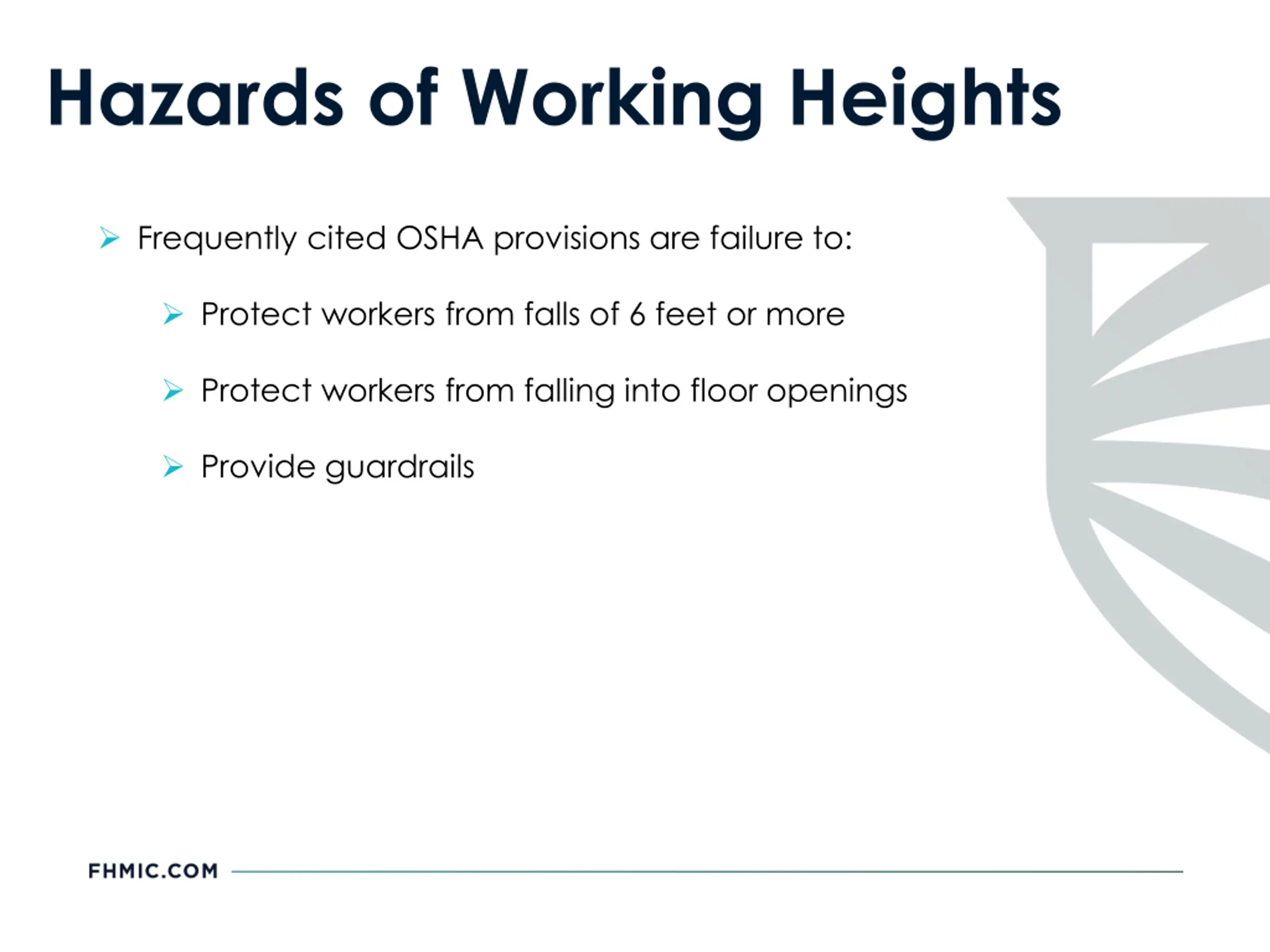 Hazards of Working Heights Frequently cited OSHA provisions are failure to: Protect workers from falls of 6 feet or more Protect workers from falling into floor openings Provide guardrails