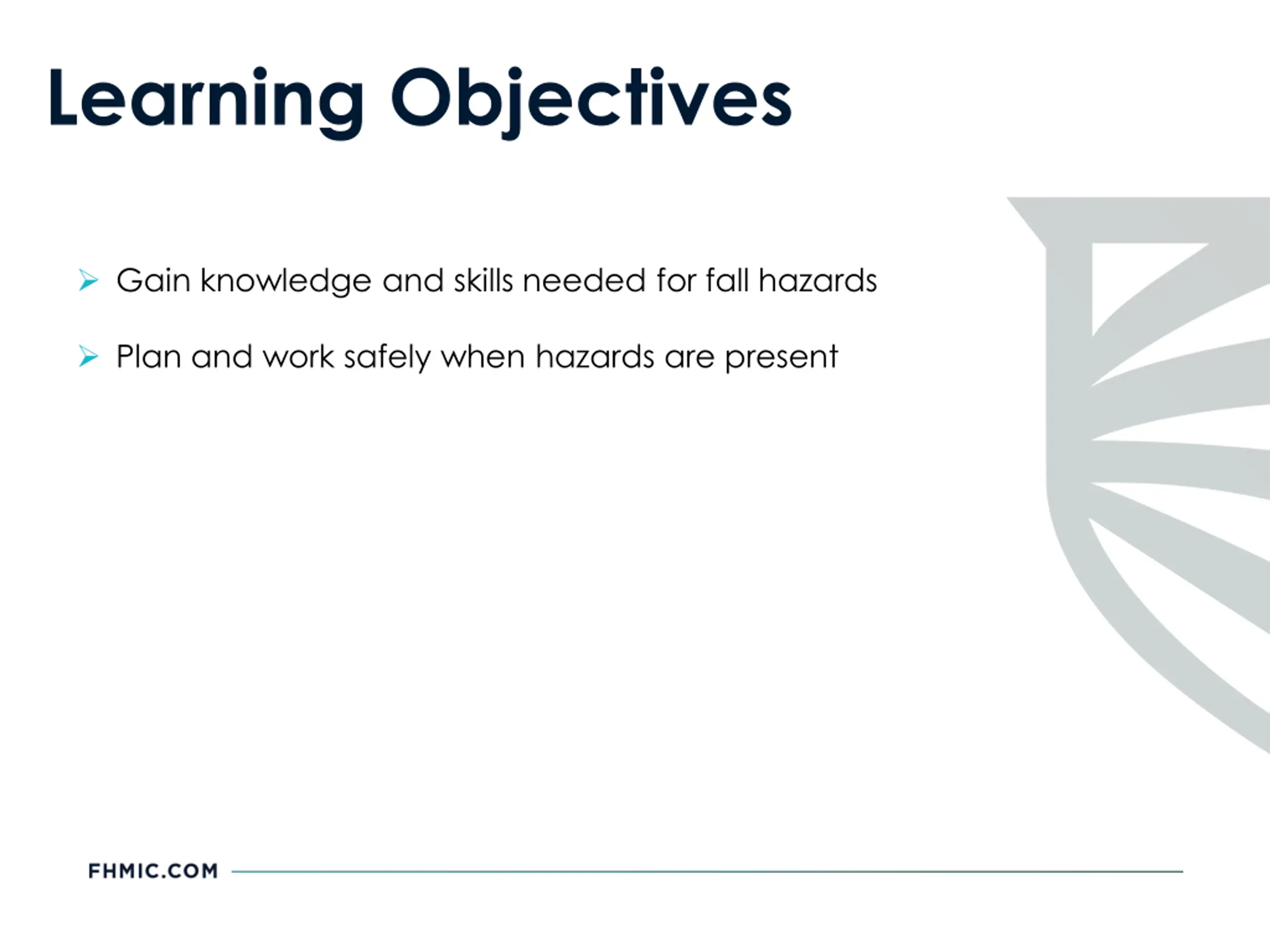 Learning Objectives Gain knowledge and skills needed for fall hazards Plan and work safely when hazards are present