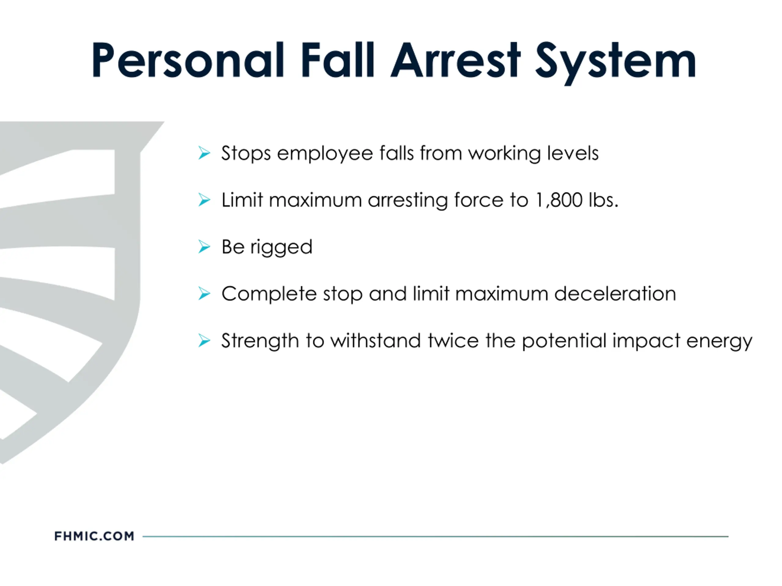 Personal Fall Arrest System Stops employee falls from working levels Limit maximum arresting force to 1,800 lbs. Be rigged Complete stop and limit maximum deceleration Strength to withstand twice the potential impact energy