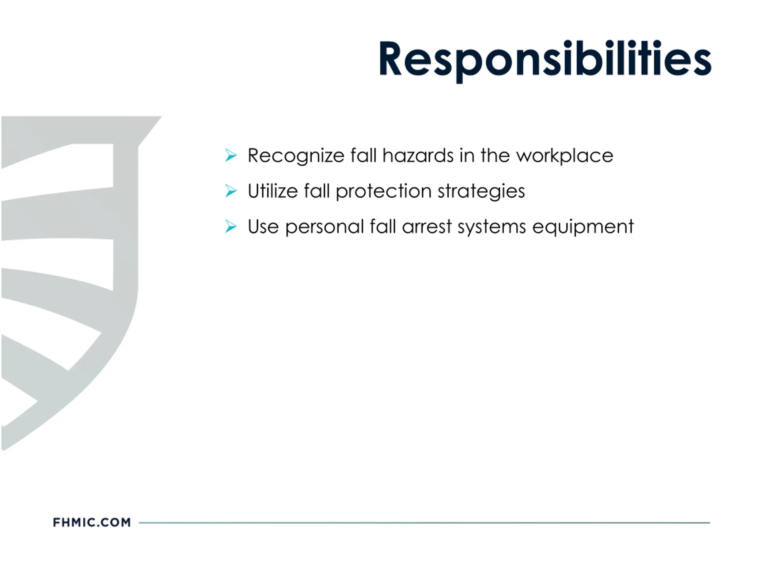 Responsibilities Recognize fall hazards in the workplace Utilize fall protection strategies Use personal fall arrest systems equipment