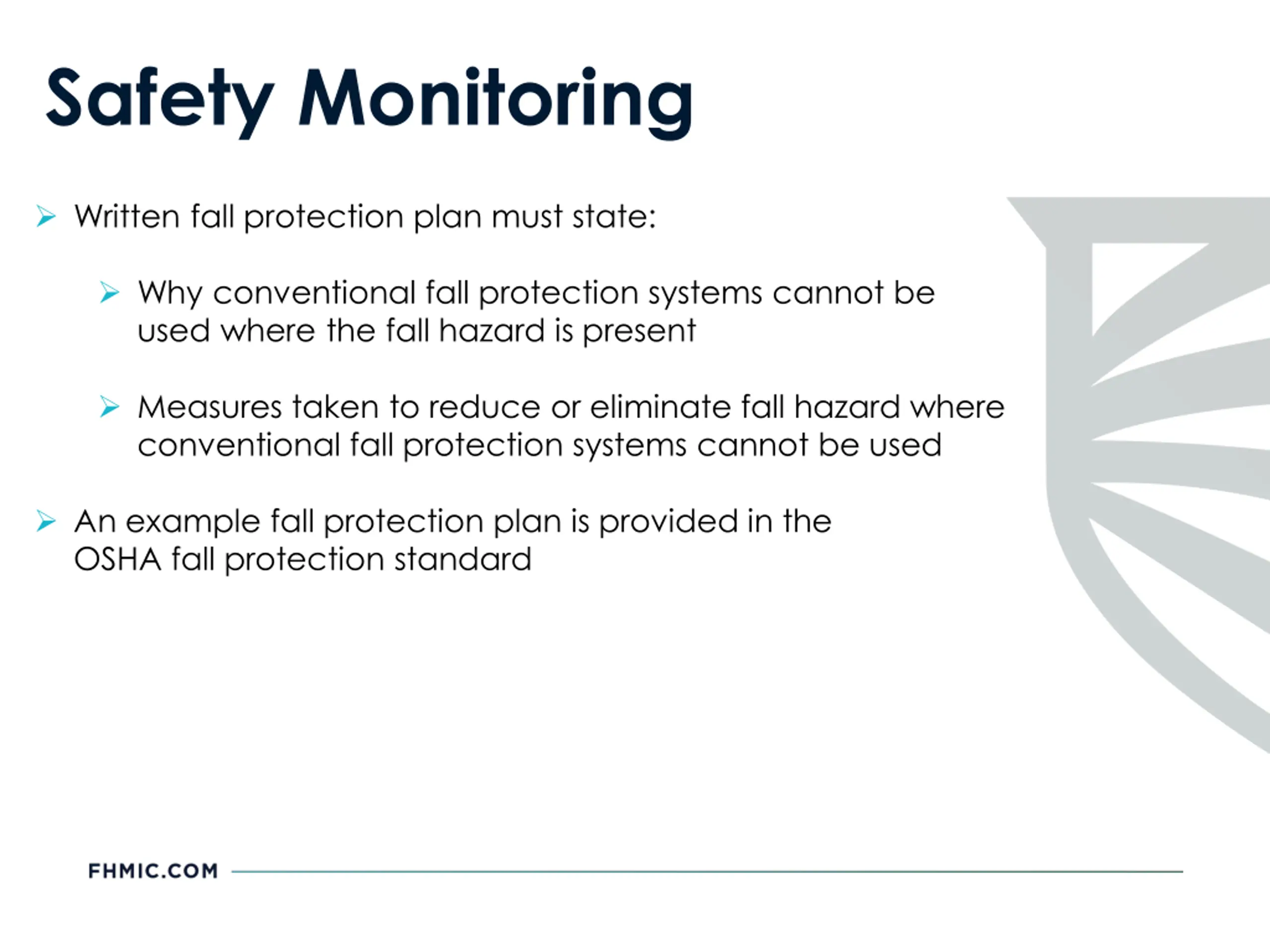 Safety Monitoring Written fall protection plan must state: Why conventional fall protection systems cannot be used where the fall hazard is present Measures taken to reduce or eliminate fall hazard where conventional fall protection systems cannot be used An example fall protection plan is provided in the OSHA fall protection standard