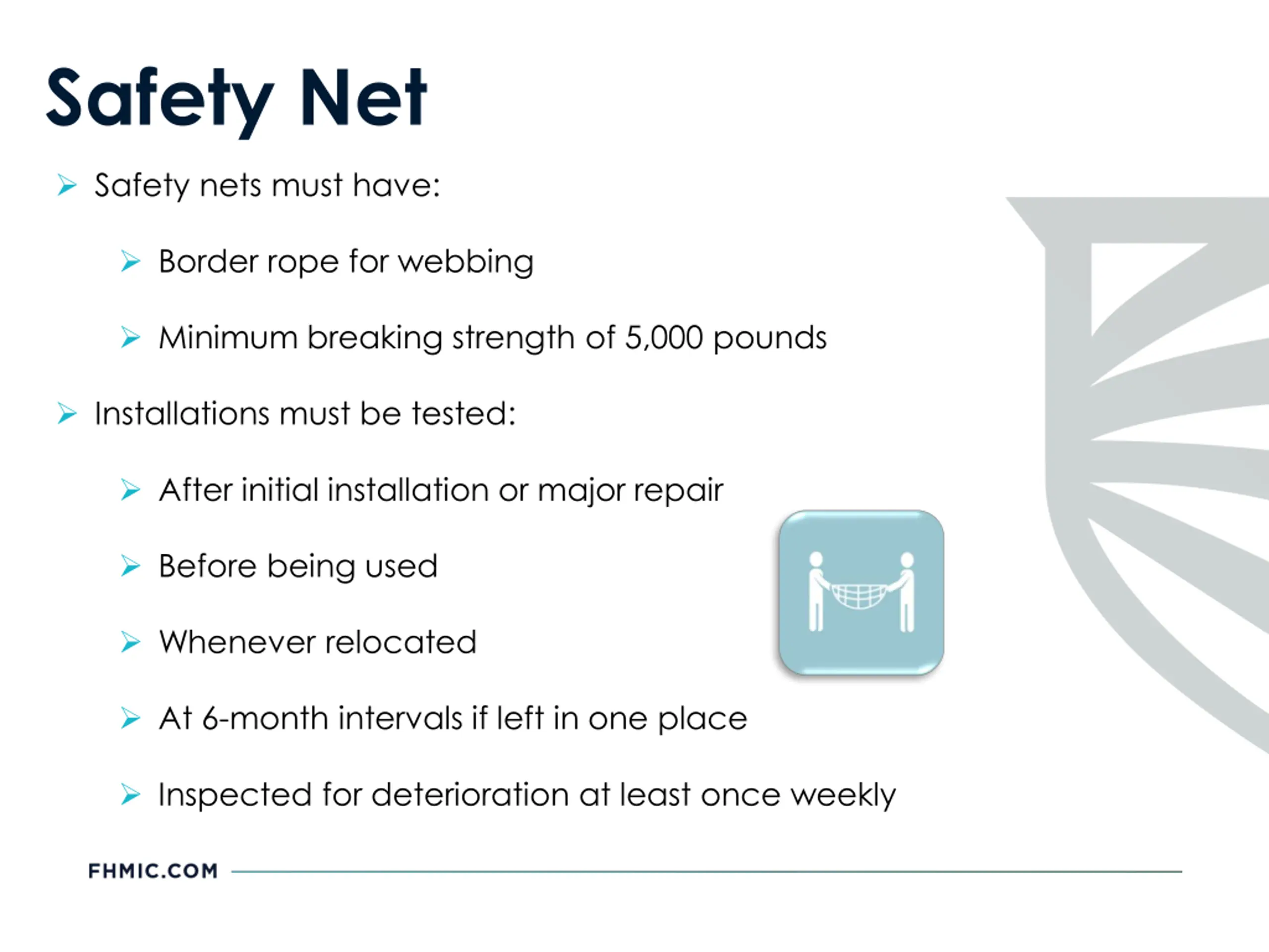 Safety Net Safety nets must have: Border rope for webbing Minimum breaking strength of 5,000 pounds Installations must be tested: After initial installation or major repair Before being used Whenever relocated At 6-month intervals if left in one place Inspected for deterioration at least once weekly