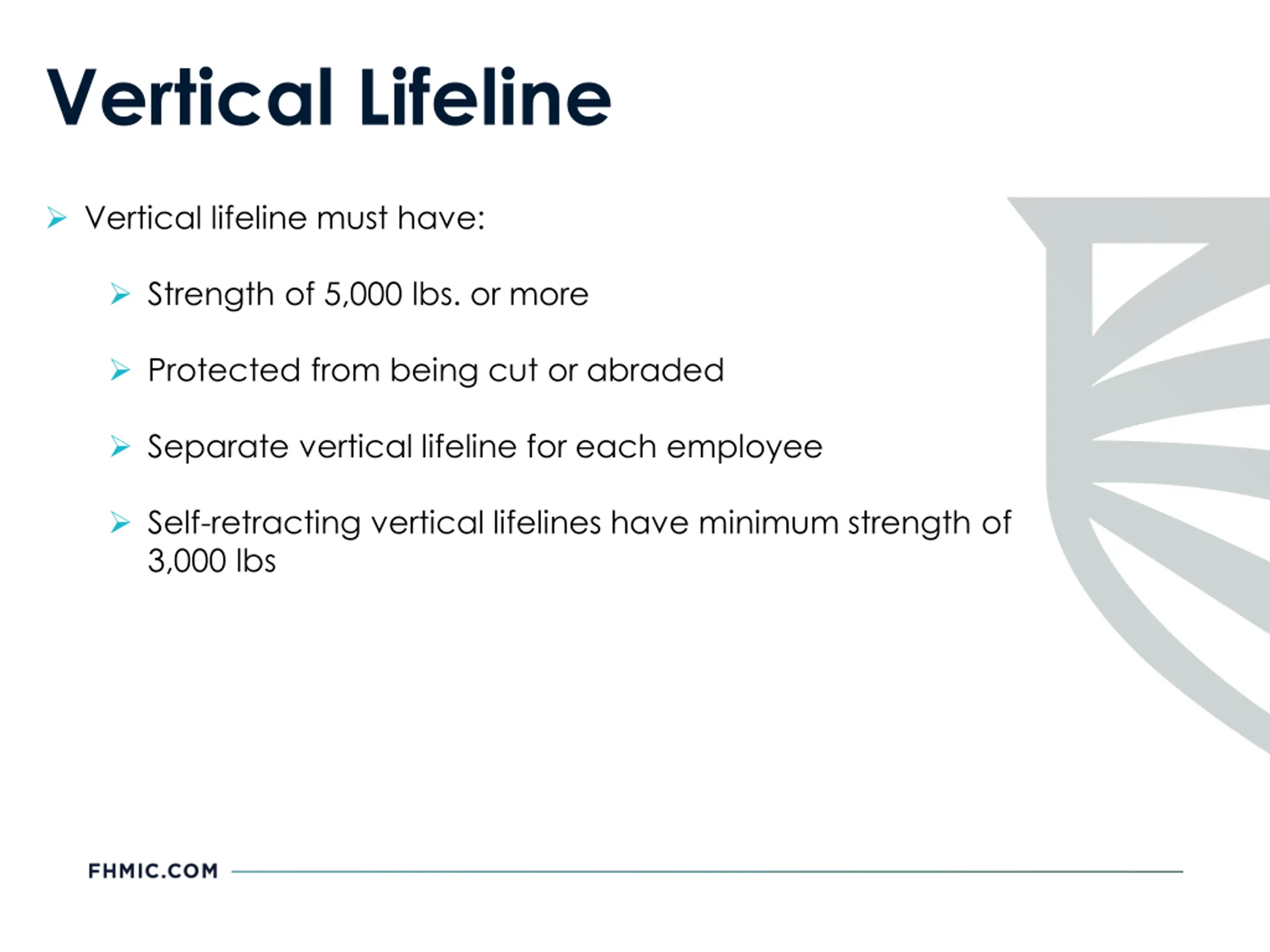 Vertical Lifeline Vertical lifeline must have: Strength of 5,000 lbs. or more Protected from being cut or abraded Separate vertical lifeline for each employee Self-retracting vertical lifelines have minimum strength of 3,000 lbs