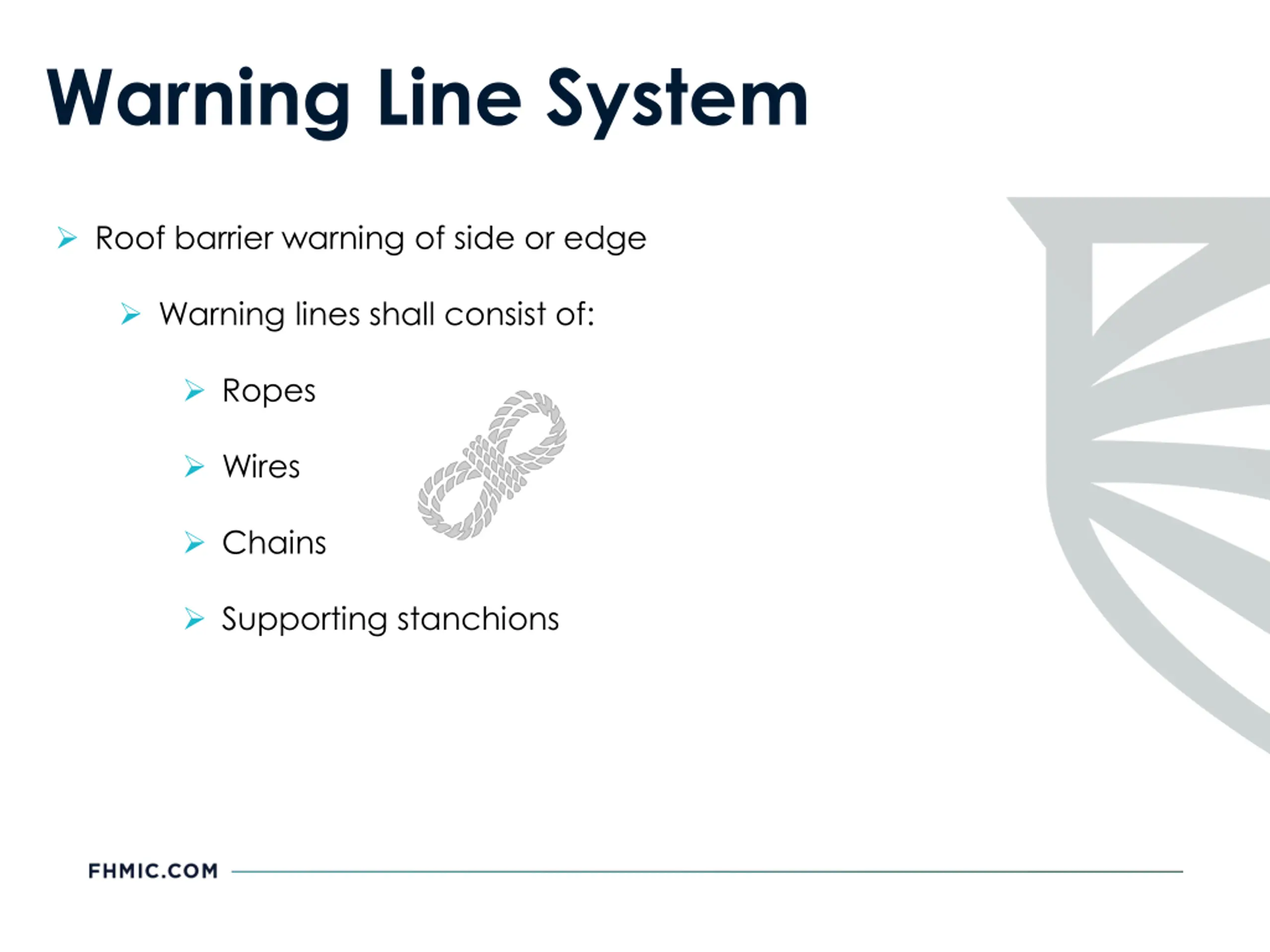 Warning Line System Roof barrier warning of side or edge Warning lines shall consist of: Ropes Wires Chains Supporting stanchions