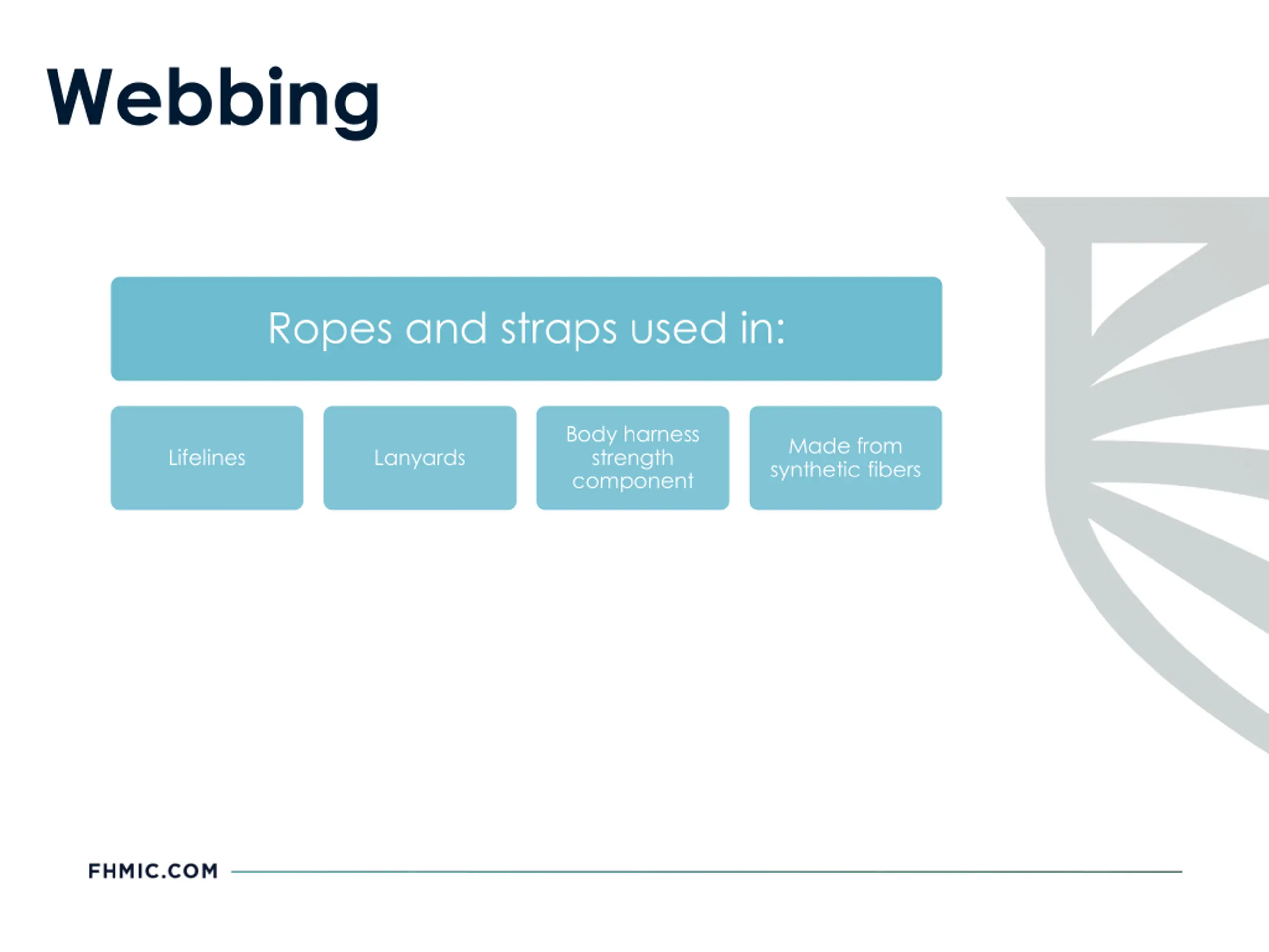 Webbing Ropes and straps used in: Body harness strength component Made from synthetic fibers Lifelines Lanyards