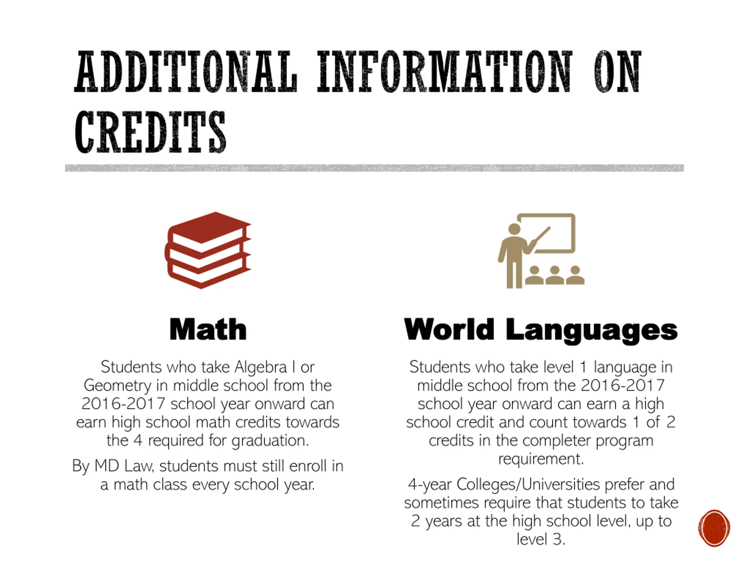 ADDITIONAL INFORMATION ON CREDITS Math Math World Languages World Languages Students who take level 1 language in middle school from the 2016-2017 school year onward can earn a high school credit and count towards 1 of 2 credits in the completer program requirement. 4-year Colleges/Universities prefer and sometimes require that students to take 2 years at the high school level, up to level 3. Students who take Algebra I or Geometry in middle school from the 2016-2017 school year onward can earn high school math credits towards the 4 required for graduation. By MD Law, students must still enroll in a math class every school year.