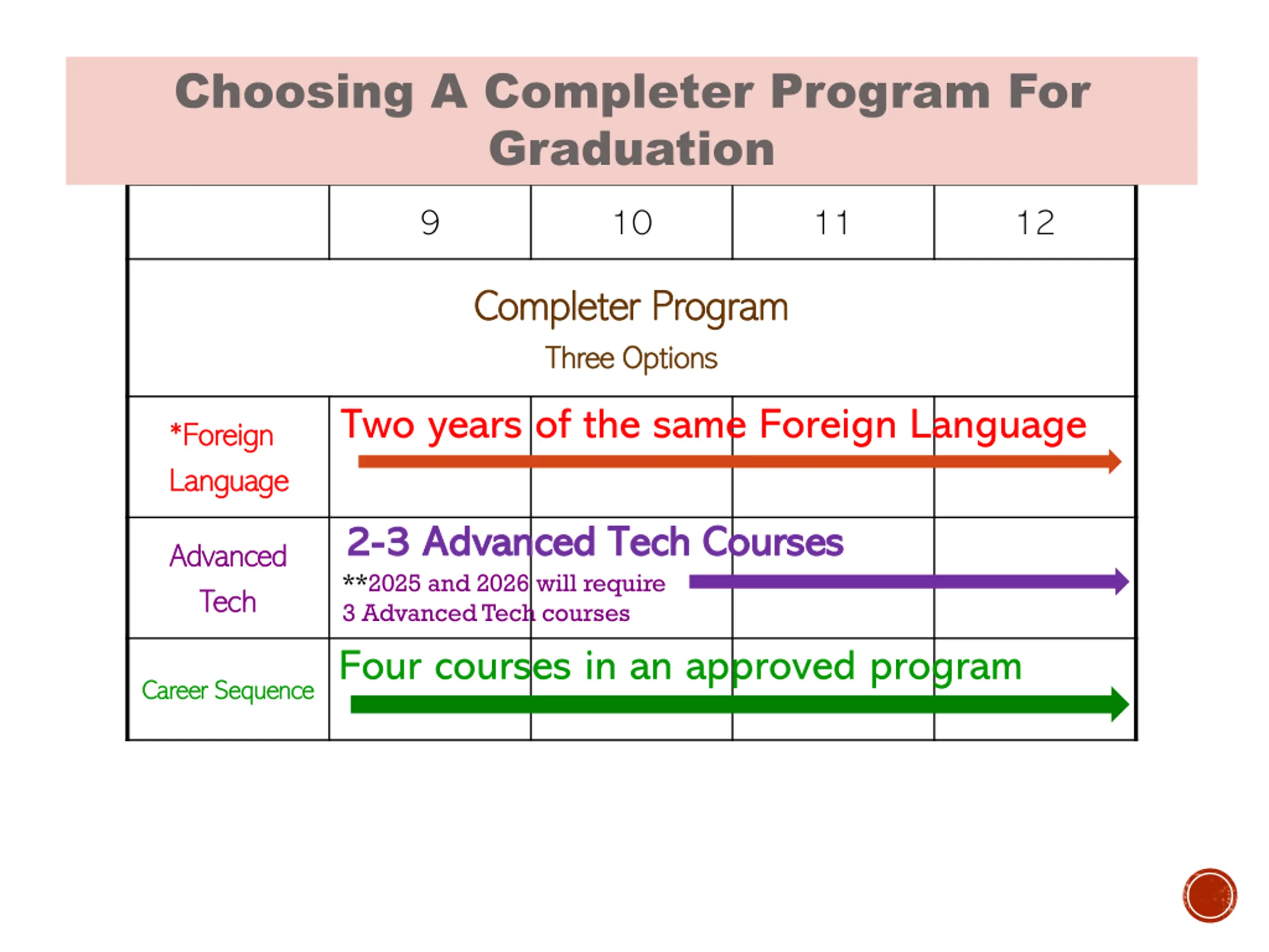 Choosing A Completer Program For Graduation 9 10 11 12 Completer Program Completer Program Three Options Three Options Two years of the same Foreign Language *Foreign *Foreign Language Language 2 2- -3 Advanced Tech Courses 3 Advanced Tech Courses **2025 and 2026 will require 3 Advanced Tech courses Advanced Advanced Tech Tech Four courses in an approved program Career Sequence Career Sequence