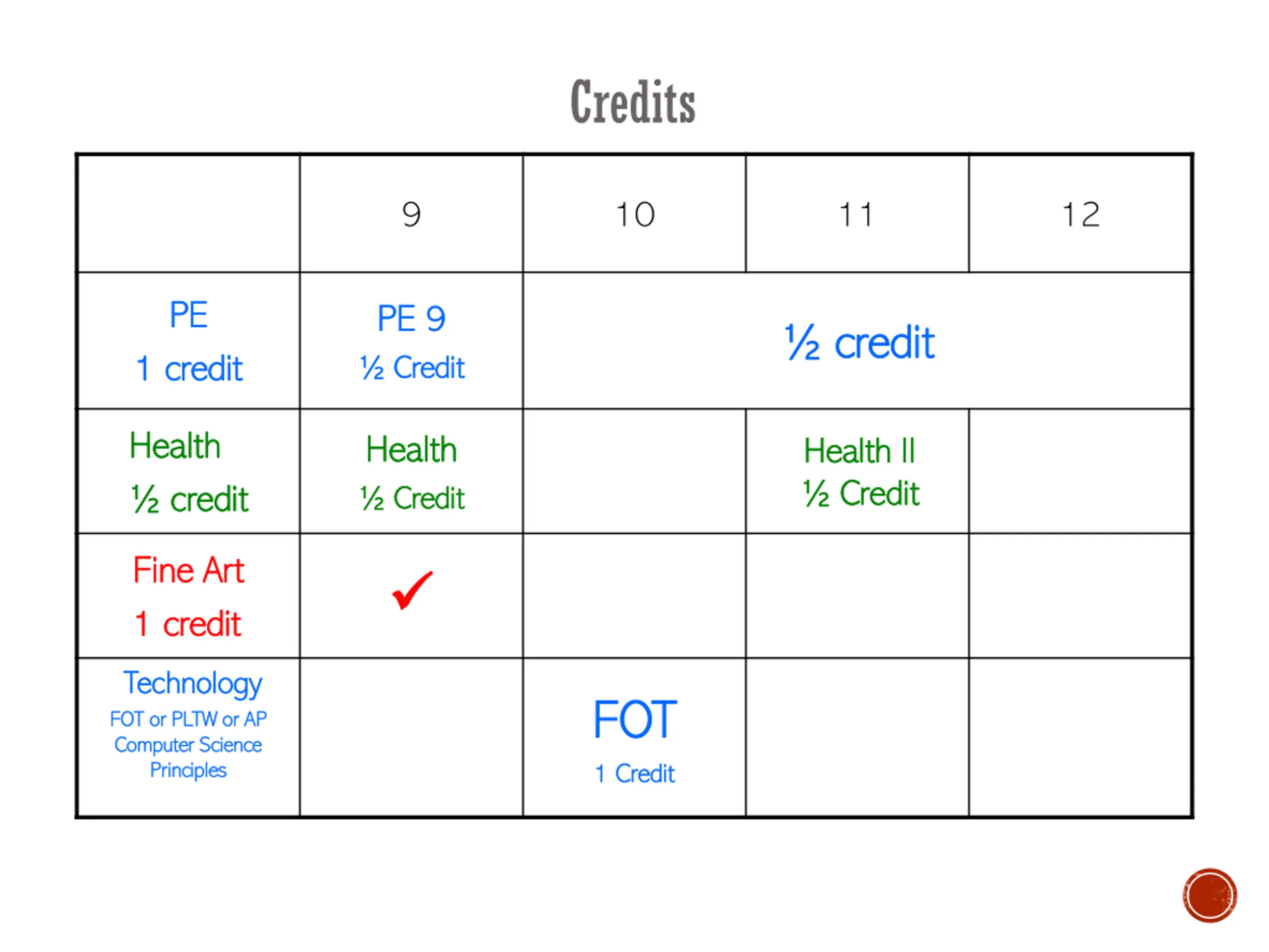 Credits 9 10 11 12 PE PE PE 9 PE 9 Credit Credit credit credit 1 credit 1 credit Health Health credit credit Health Health Credit Credit Health II Health II Credit Credit Fine Art Fine Art 1 credit 1 credit Technology Technology FOT or PLTW or AP FOT or PLTW or AP Computer Science Computer Science Principles Principles FOT FOT 1 Credit 1 Credit