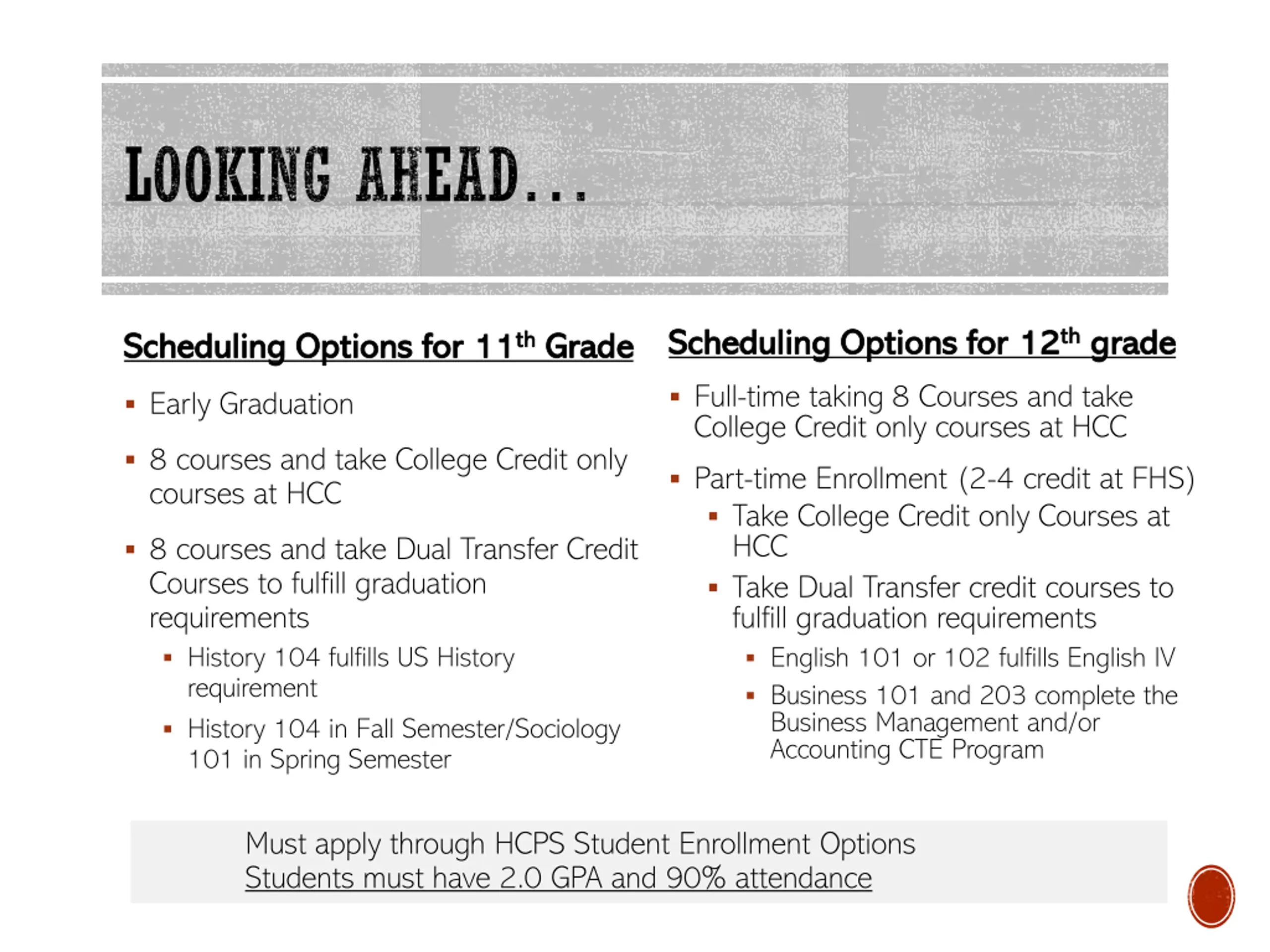 LOOKING AHEAD Scheduling Options for 12 Scheduling Options for 12th th grade grade Scheduling Options for 11 Scheduling Options for 11th th Grade Grade Full-time taking 8 Courses and take College Credit only courses at HCC Early Graduation 8 courses and take College Credit only courses at HCC Part-time Enrollment (2-4 credit at FHS) Take College Credit only Courses at HCC Take Dual Transfer credit courses to fulfill graduation requirements English 101 or 102 fulfills English IV Business 101 and 203 complete the Business Management and/or Accounting CTE Program 8 courses and take Dual Transfer Credit Courses to fulfill graduation requirements History 104 fulfills US History requirement History 104 in Fall Semester/Sociology 101 in Spring Semester Must apply through HCPS Student Enrollment Options Students must have 2.0 GPA and 90% attendance