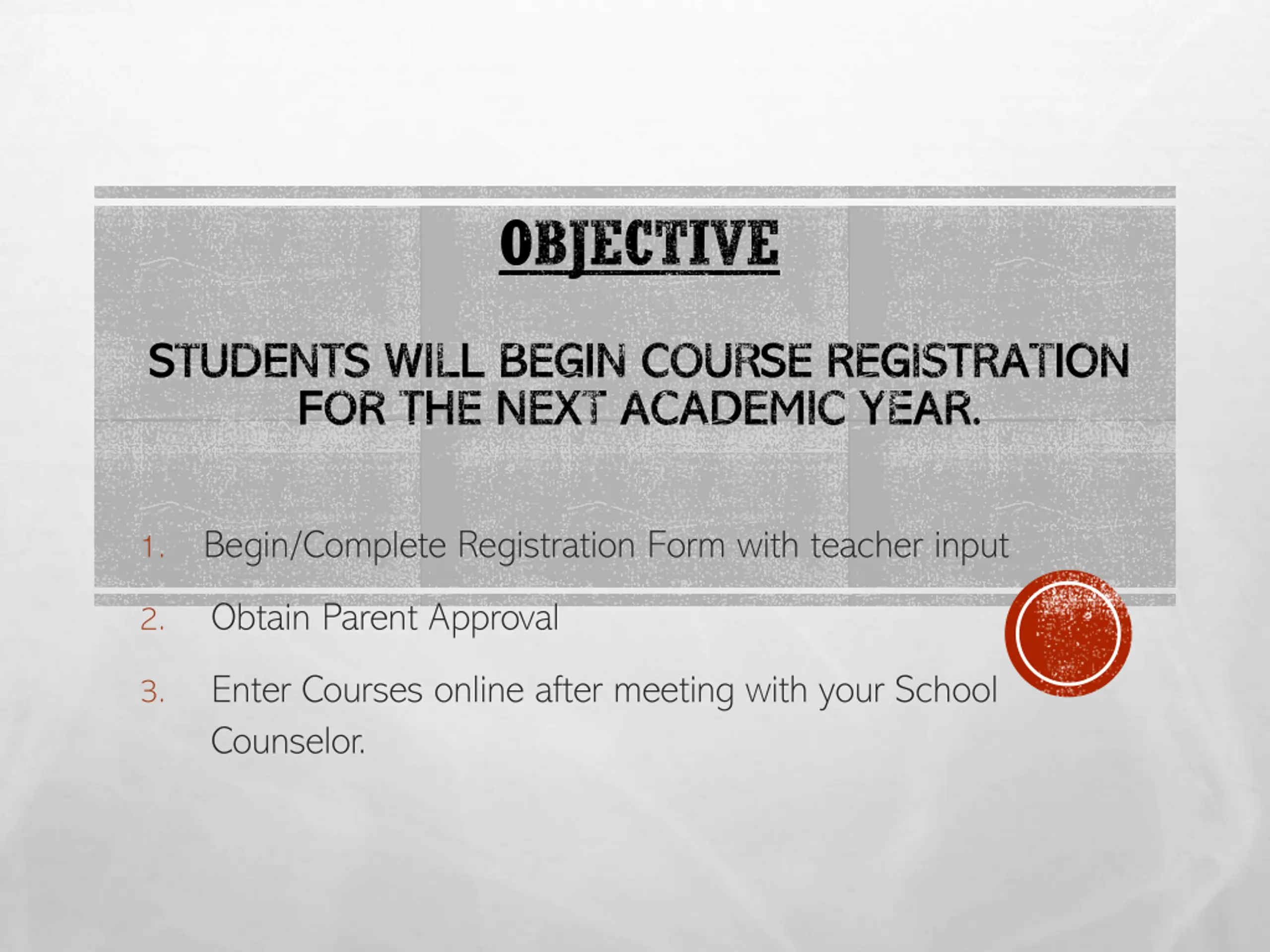 OBJECTIVE STUDENTS WILL BEGIN COURSE REGISTRATION STUDENTS WILL BEGIN COURSE REGISTRATION FOR THE NEXT ACADEMIC YEAR. FOR THE NEXT ACADEMIC YEAR. Begin/Complete Registration Form with teacher input 1. Obtain Parent Approval 2. Enter Courses online after meeting with your School Counselor. 3.