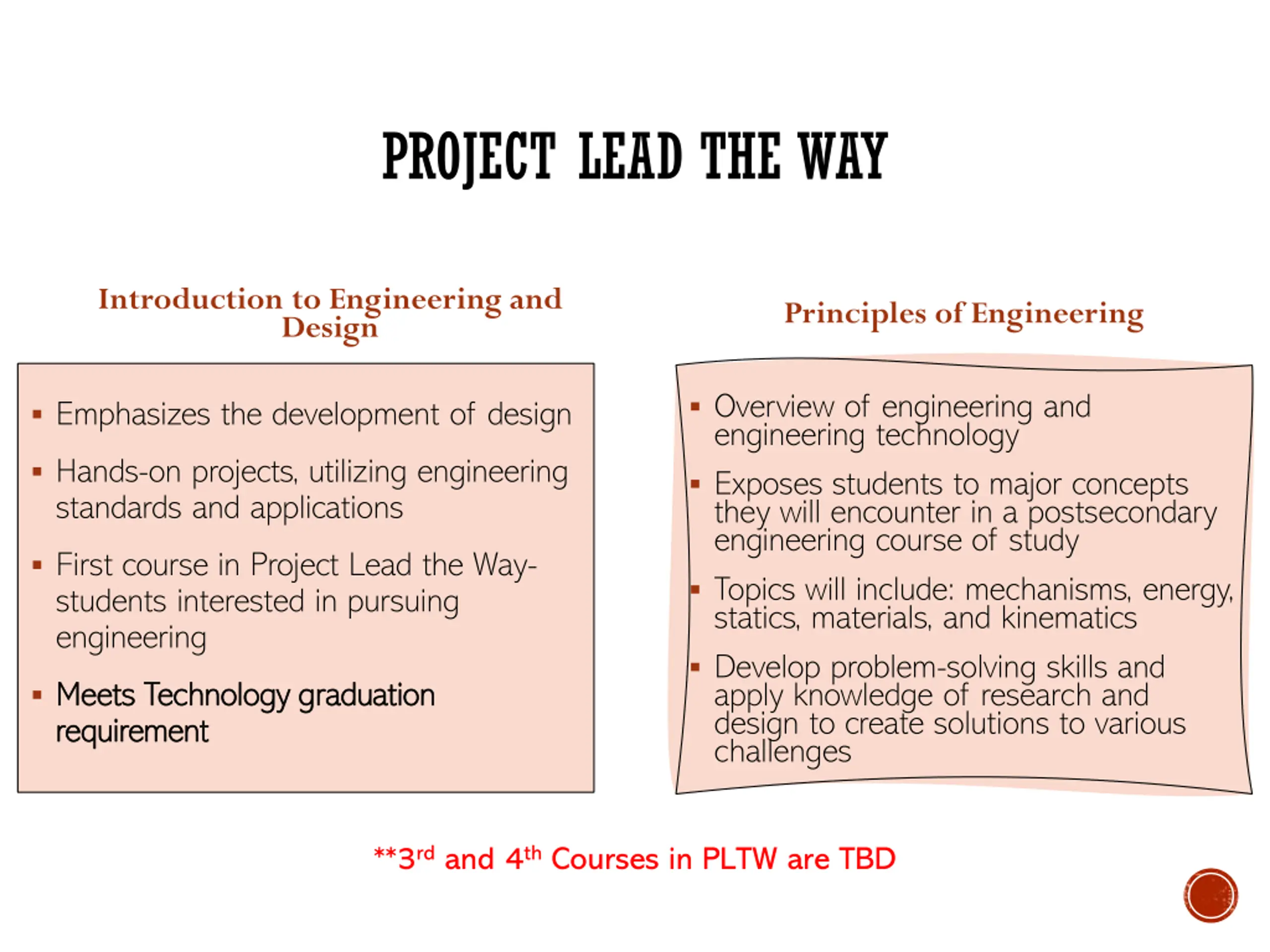 PROJECT LEAD THE WAY Introduction to Engineering and Design Principles of Engineering Overview of engineering and engineering technology Exposes students to major concepts they will encounter in a postsecondary engineering course of study Topics will include: mechanisms, energy, statics, materials, and kinematics Develop problem-solving skills and apply knowledge of research and design to create solutions to various challenges Emphasizes the development of design Hands-on projects, utilizing engineering standards and applications First course in Project Lead the Way- students interested in pursuing engineering Meets Technology graduation Meets Technology graduation requirement requirement **3rd and 4th Courses in PLTW are TBD