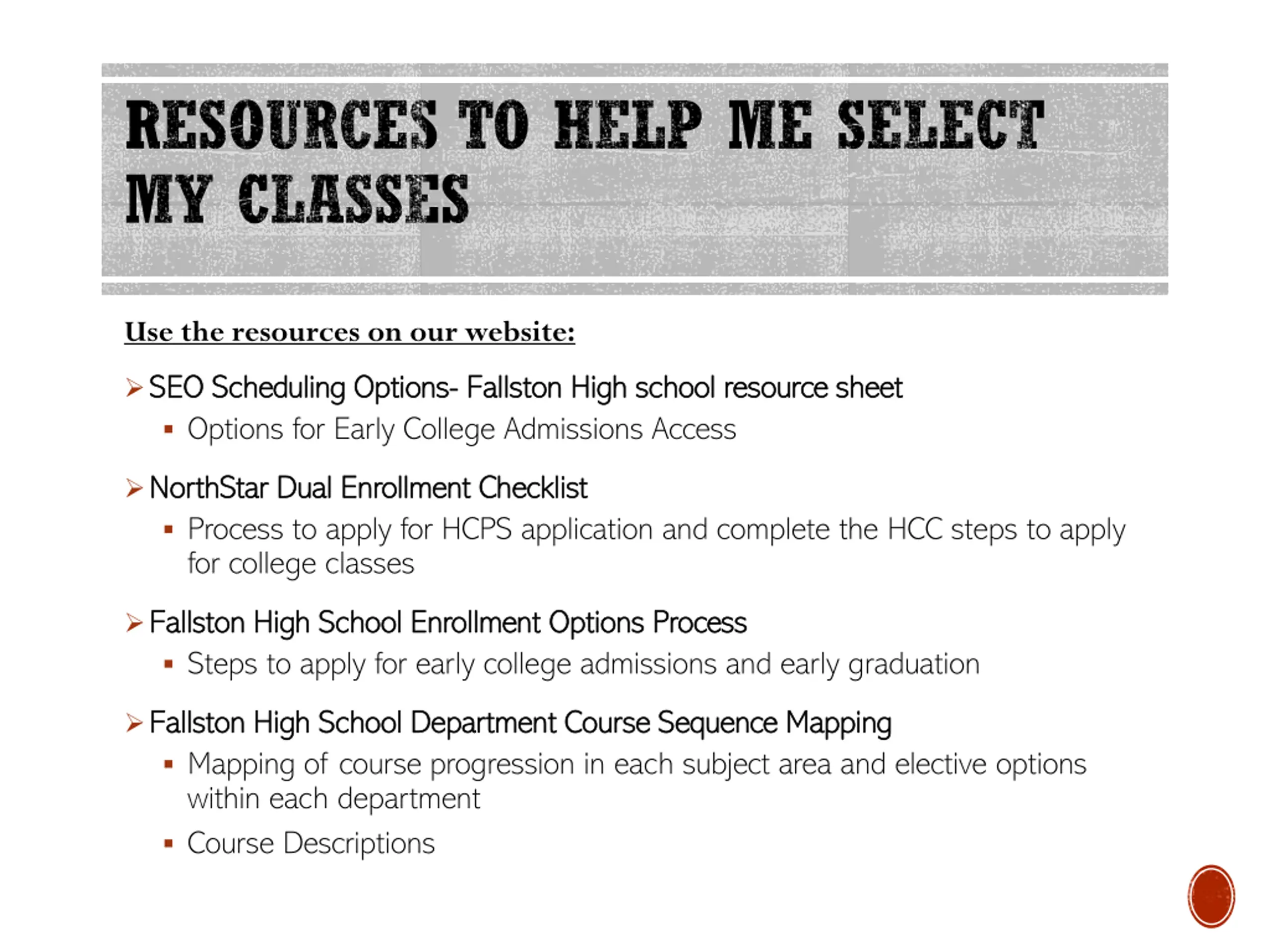 RESOURCES TO HELP ME SELECT MY CLASSES Use the resources on our website: SEO Scheduling Options SEO Scheduling Options- - Fallston High school resource sheet Fallston High school resource sheet Options for Early College Admissions Access NorthStar Dual Enrollment Checklist NorthStar Dual Enrollment Checklist Process to apply for HCPS application and complete the HCC steps to apply for college classes Fallston High School Enrollment Options Process Fallston High School Enrollment Options Process Steps to apply for early college admissions and early graduation Fallston High School Department Course Sequence Mapping Fallston High School Department Course Sequence Mapping Mapping of course progression in each subject area and elective options within each department Course Descriptions