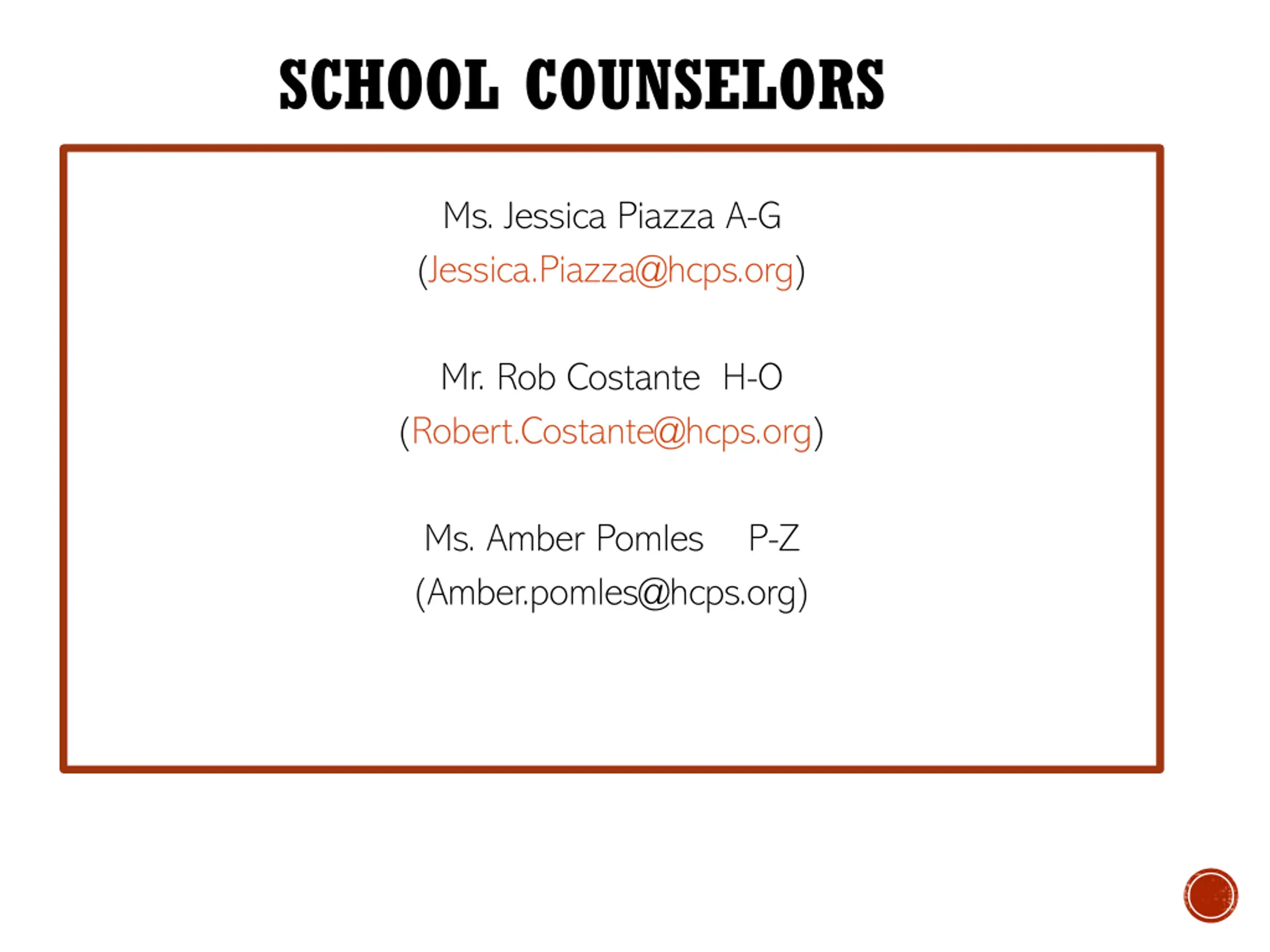 SCHOOL COUNSELORS Ms. Jessica Piazza A-G (Jessica.Piazza@hcps.org) Mr. Rob Costante H-O (Robert.Costante@hcps.org) Ms. Amber Pomles P-Z (Amber.pomles@hcps.org)