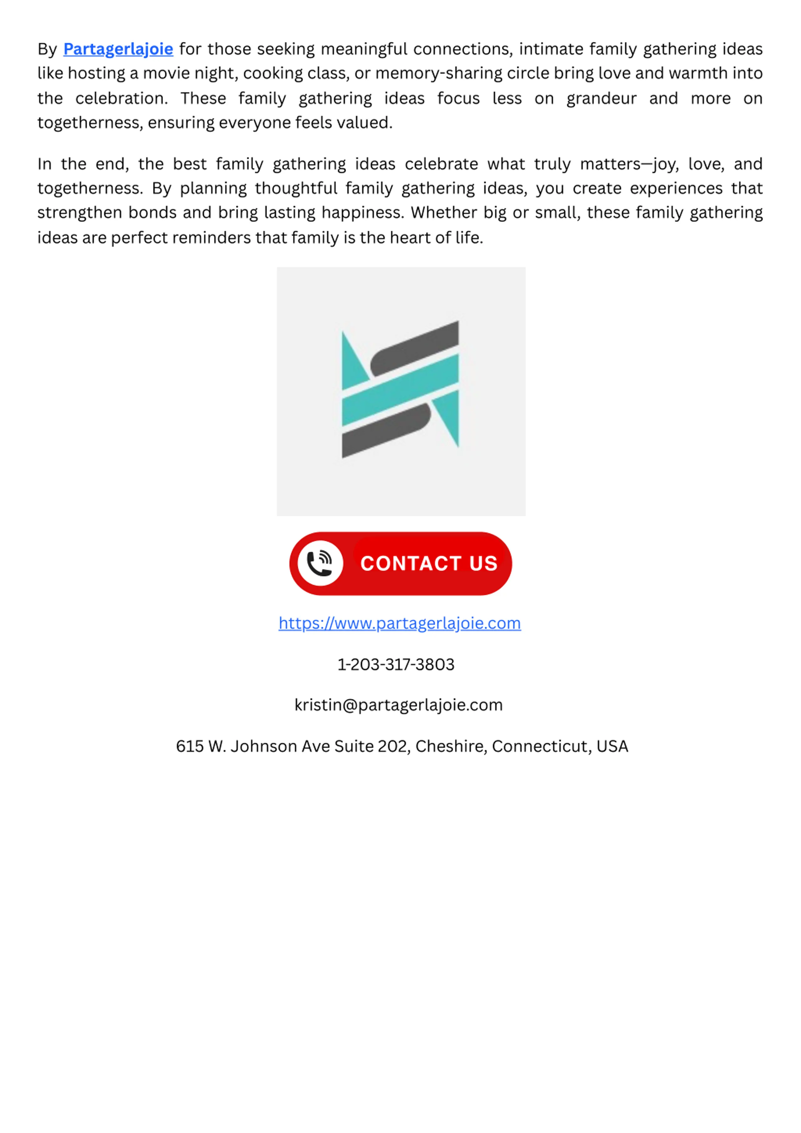 By Partagerlajoie for those seeking meaningful connections, intimate family gathering ideas like hosting a movie night, cooking class, or memory-sharing circle bring love and warmth into the celebration. These family gathering ideas focus less on grandeur and more on togetherness, ensuring everyone feels valued. In the end, the best family gathering ideas celebrate what truly matters joy, love, and togetherness. By planning thoughtful family gathering ideas, you create experiences that strengthen bonds and bring lasting happiness. Whether big or small, these family gathering ideas are perfect reminders that family is the heart of life. https://www.partagerlajoie.com 1-203-317-3803 kristin@partagerlajoie.com 615 W. Johnson Ave Suite 202, Cheshire, Connecticut, USA