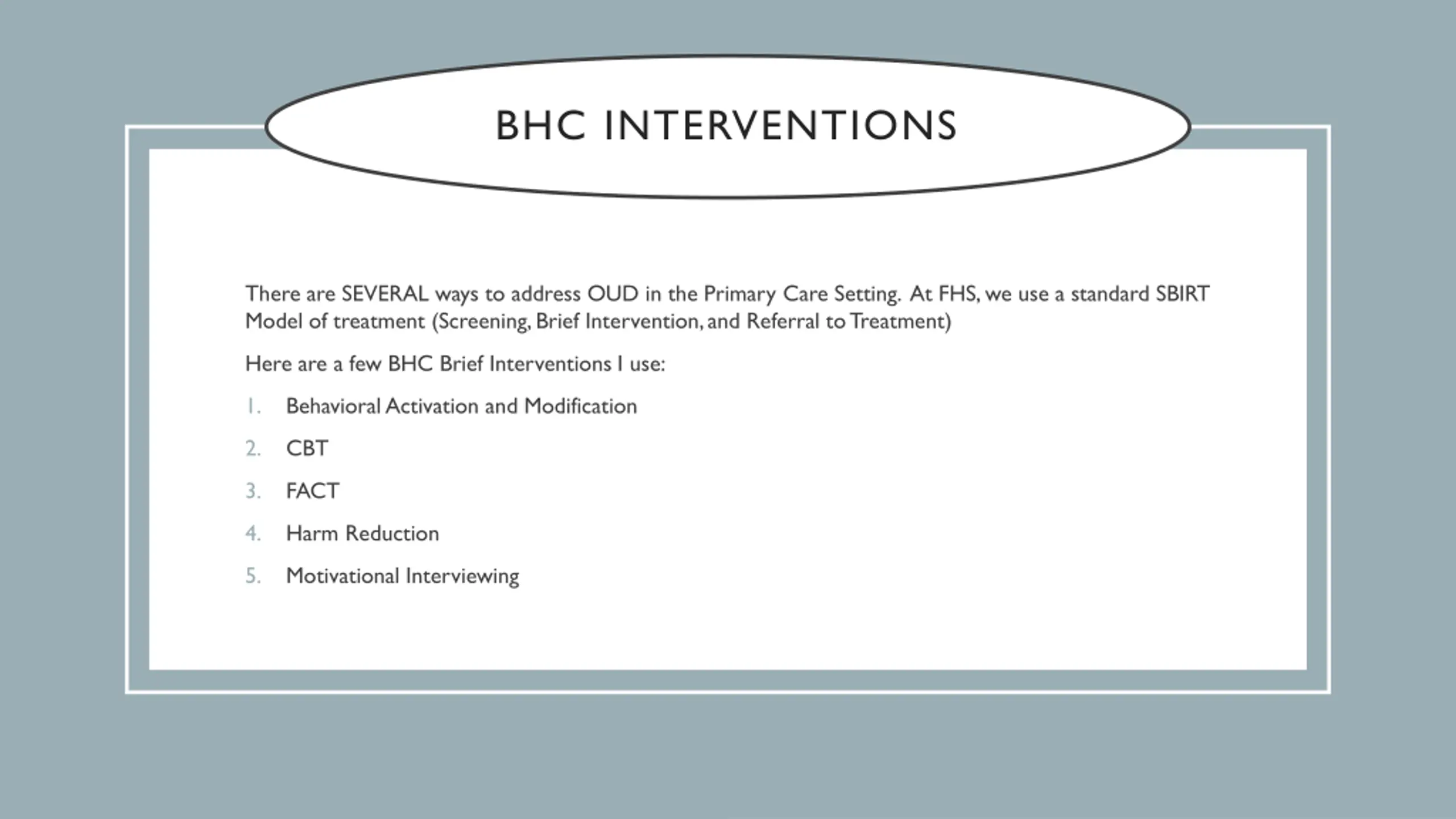BHC INTERVENTIONS There are SEVERAL ways to address OUD in the Primary Care Setting. At FHS, we use a standard SBIRT Model of treatment (Screening, Brief Intervention, and Referral to Treatment) Here are a few BHC Brief Interventions I use: 1. Behavioral Activation and Modification 2. CBT 3. FACT 4. Harm Reduction 5. Motivational Interviewing