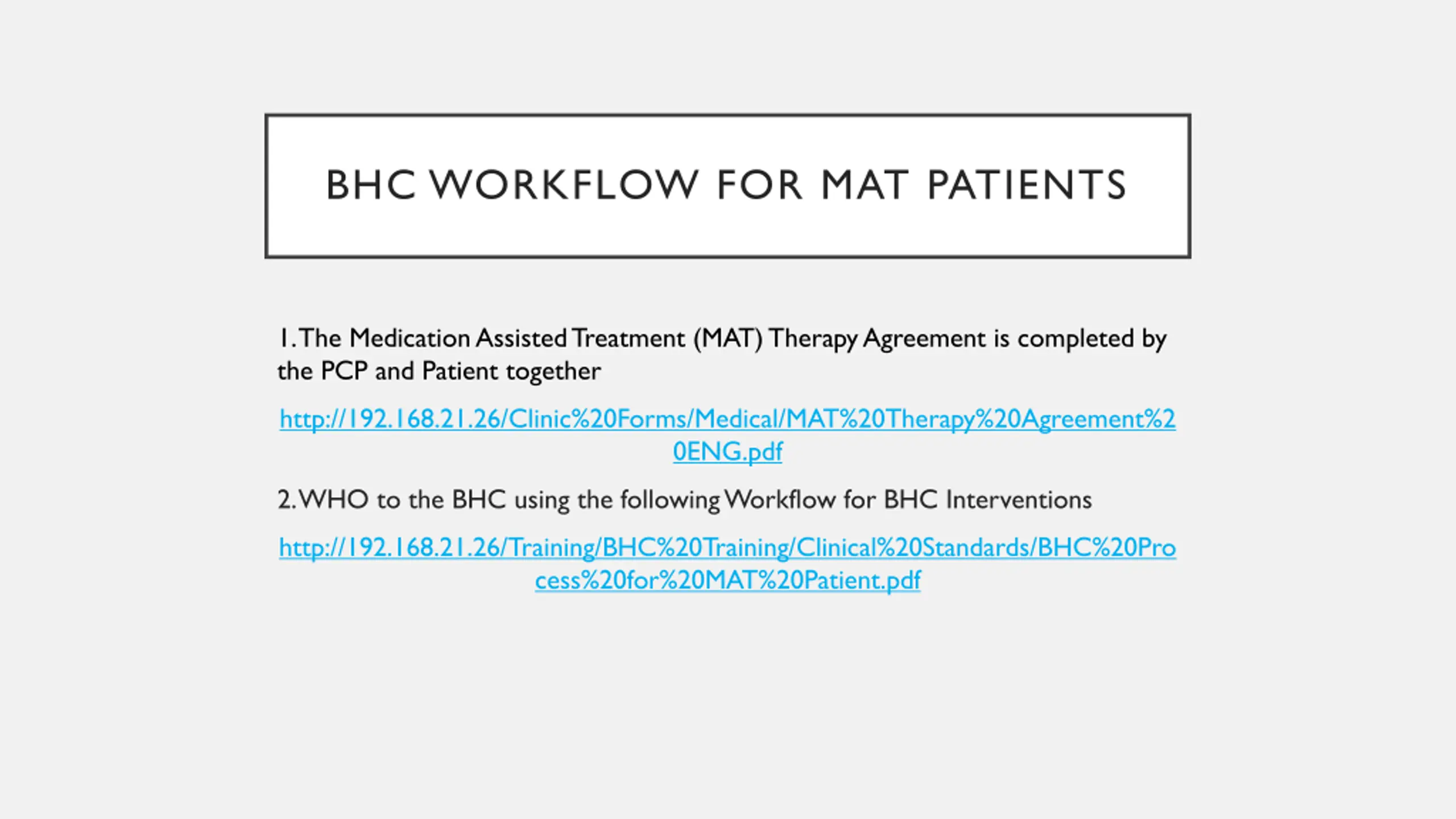 BHC WORKFLOW FOR MAT PATIENTS 1. The Medication Assisted Treatment (MAT) Therapy Agreement is completed by the PCP and Patient together http://192.168.21.26/Clinic%20Forms/Medical/MAT%20Therapy%20Agreement%2 0ENG.pdf 2. WHO to the BHC using the following Workflow for BHC Interventions http://192.168.21.26/Training/BHC%20Training/Clinical%20Standards/BHC%20Pro cess%20for%20MAT%20Patient.pdf
