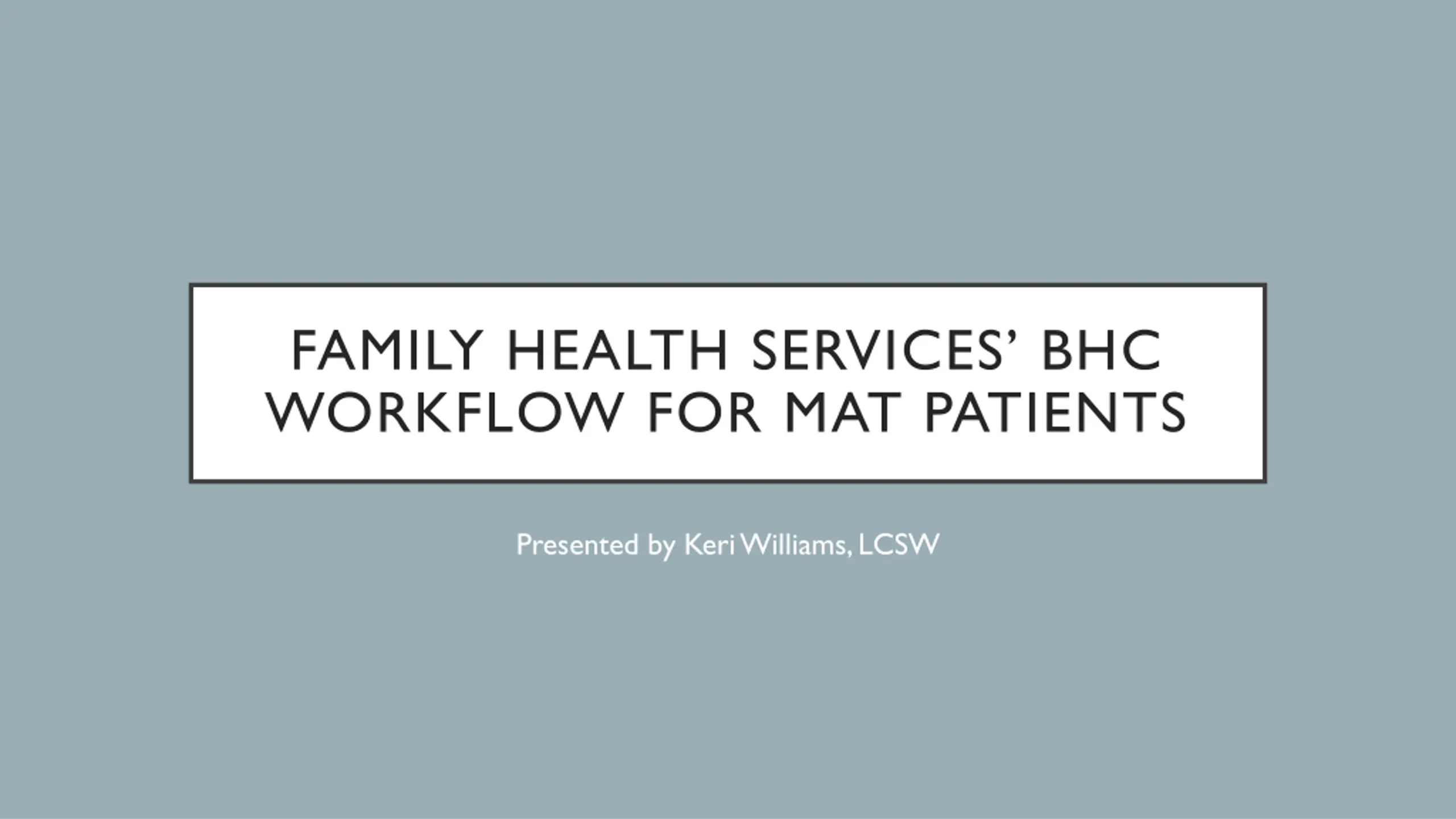 FAMILY HEALTH SERVICES BHC WORKFLOW FOR MAT PATIENTS Presented by Keri Williams, LCSW