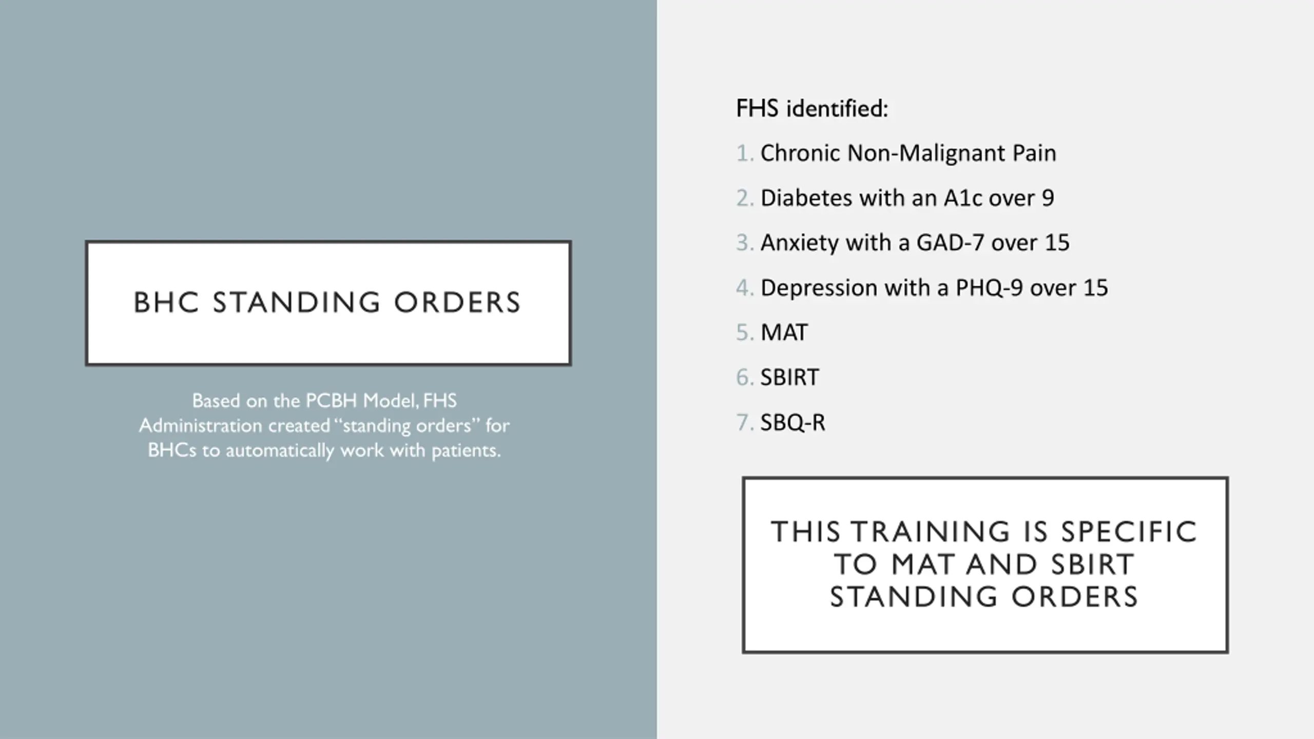 FHS identified: 1.Chronic Non-Malignant Pain 2.Diabetes with an A1c over 9 3.Anxiety with a GAD-7 over 15 4.Depression with a PHQ-9 over 15 BHC STANDING ORDERS 5.MAT 6.SBIRT Based on the PCBH Model, FHS Administration created standing orders for BHCs to automatically work with patients. 7.SBQ-R THIS TRAINING IS SPECIFIC TO MAT AND SBIRT STANDING ORDERS