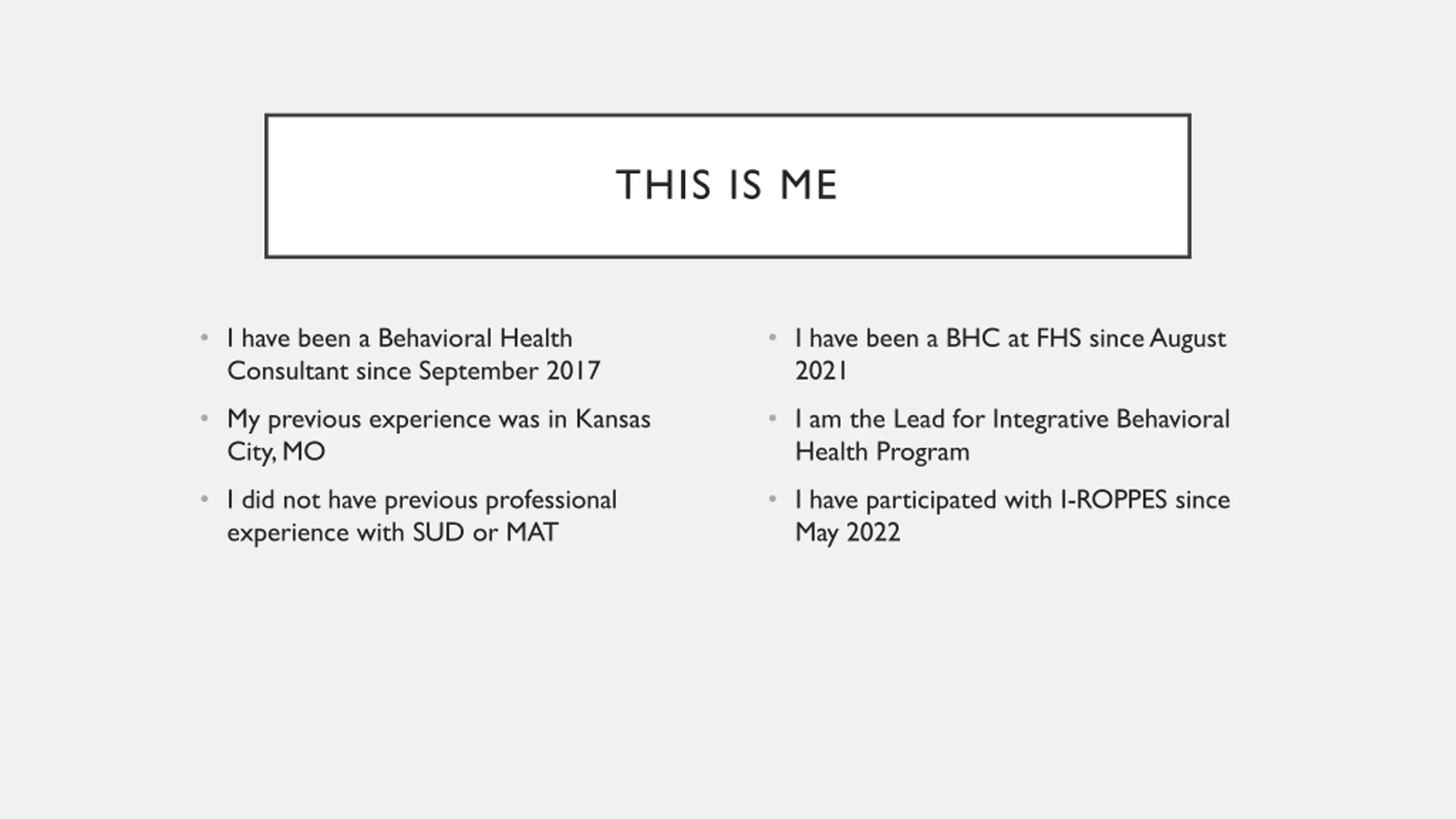 THIS IS ME I have been a Behavioral Health Consultant since September 2017 I have been a BHC at FHS since August 2021 My previous experience was in Kansas City, MO I am the Lead for Integrative Behavioral Health Program I did not have previous professional experience with SUD or MAT I have participated with I-ROPPES since May 2022