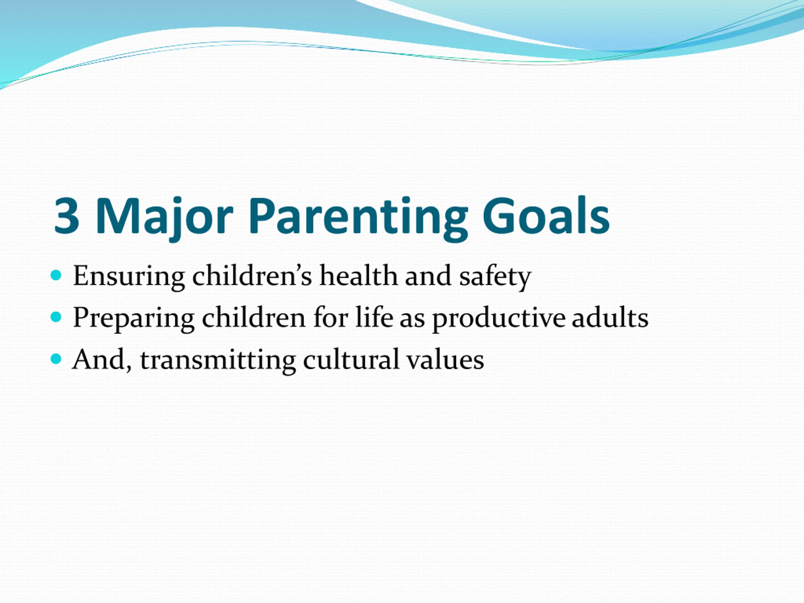 3 Major Parenting Goals Ensuring children s health and safety Preparing children for life as productive adults And, transmitting cultural values