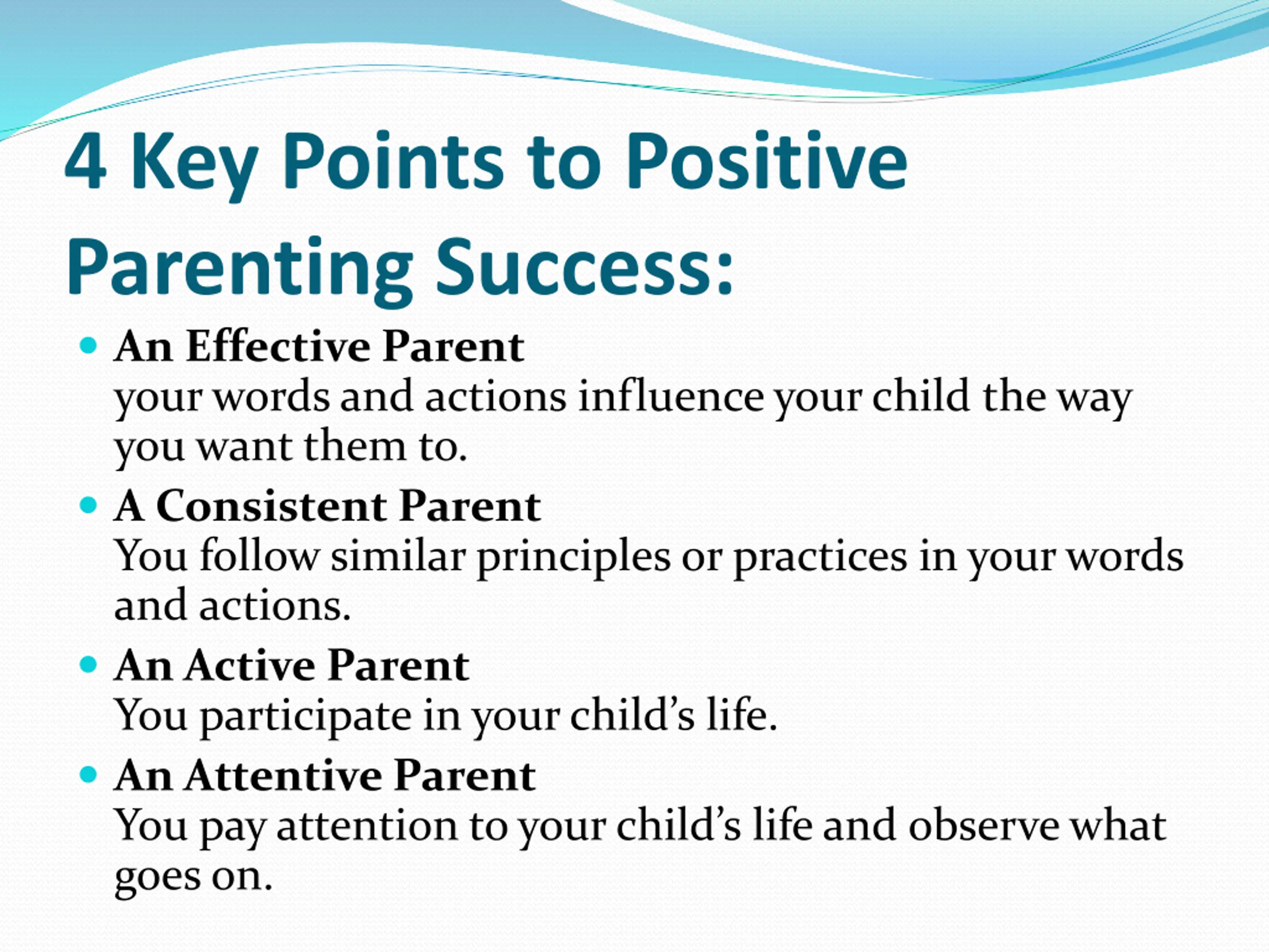 4 Key Points to Positive Parenting Success: An Effective Parent your words and actions influence your child the way you want them to. A Consistent Parent You follow similar principles or practices in your words and actions. An Active Parent You participate in your child s life. An Attentive Parent You pay attention to your child s life and observe what goes on.