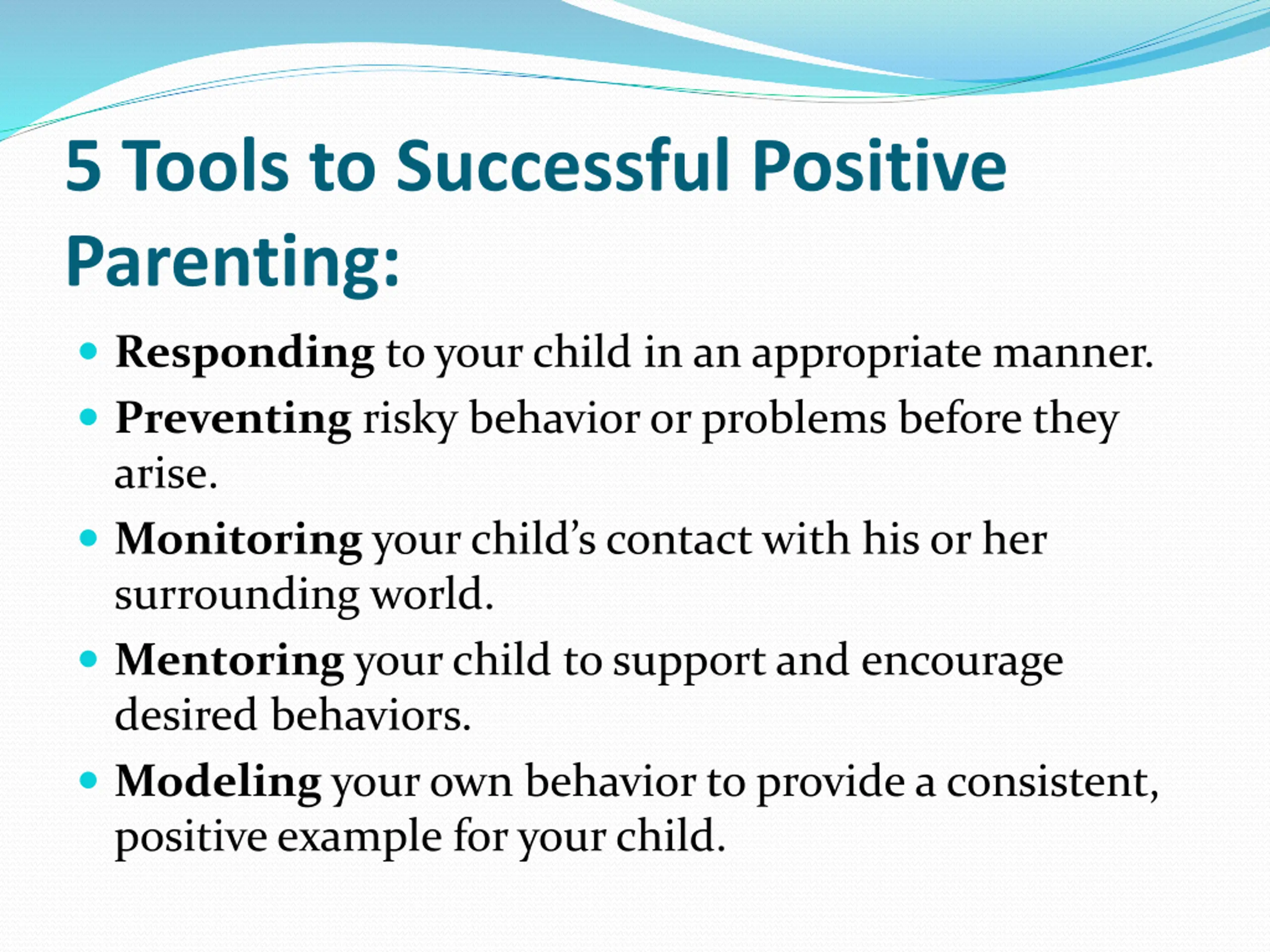 5 Tools to Successful Positive Parenting: Responding to your child in an appropriate manner. Preventing risky behavior or problems before they arise. Monitoring your child s contact with his or her surrounding world. Mentoring your child to support and encourage desired behaviors. Modeling your own behavior to provide a consistent, positive example for your child.