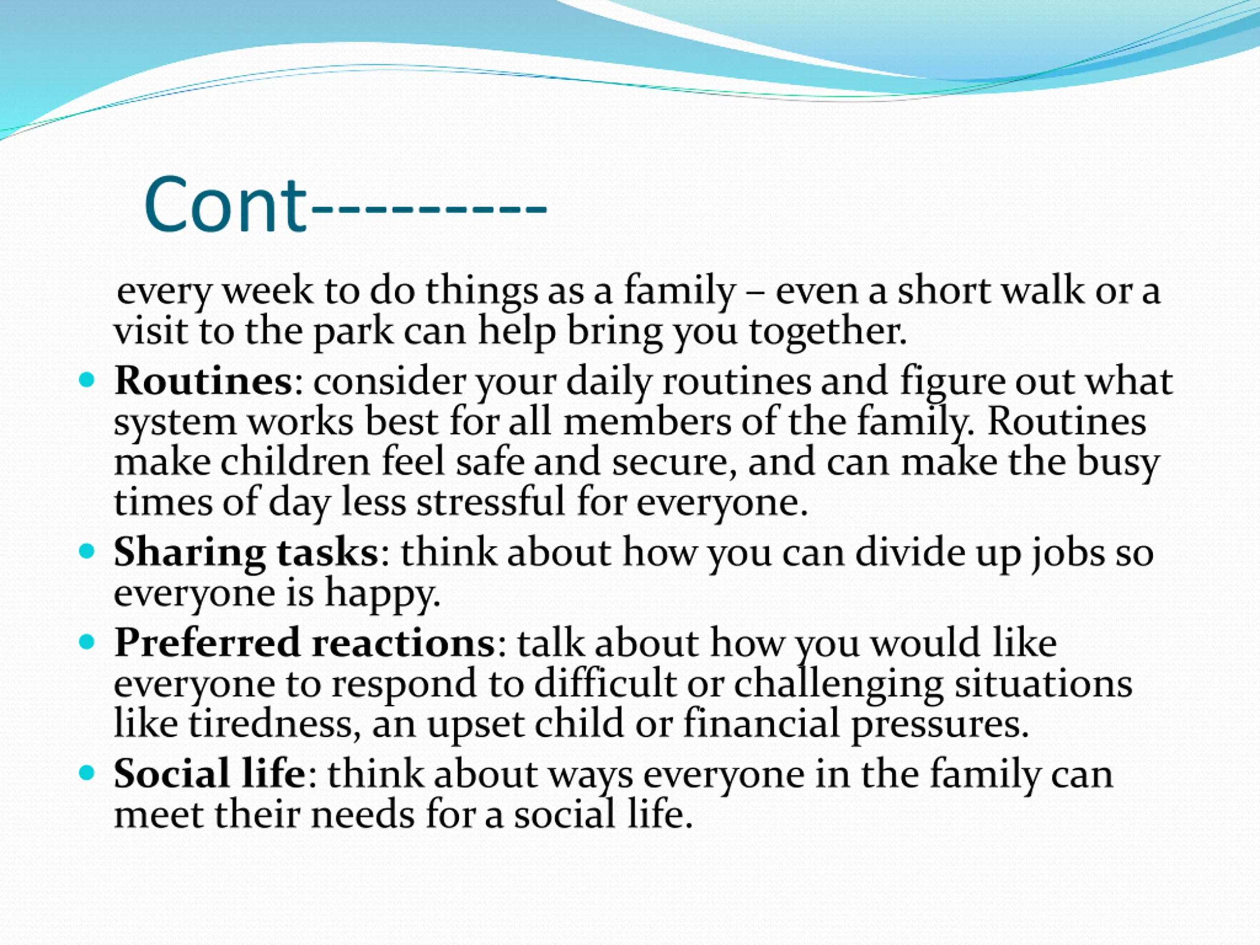 Cont--------- every week to do things as a family even a short walk or a visit to the park can help bring you together. Routines: consider your daily routines and figure out what system works best for all members of the family. Routines make children feel safe and secure, and can make the busy times of day less stressful for everyone. Sharing tasks: think about how you can divide up jobs so everyone is happy. Preferred reactions: talk about how you would like everyone to respond to difficult or challenging situations like tiredness, an upset child or financial pressures. Social life: think about ways everyone in the family can meet their needs for a social life.