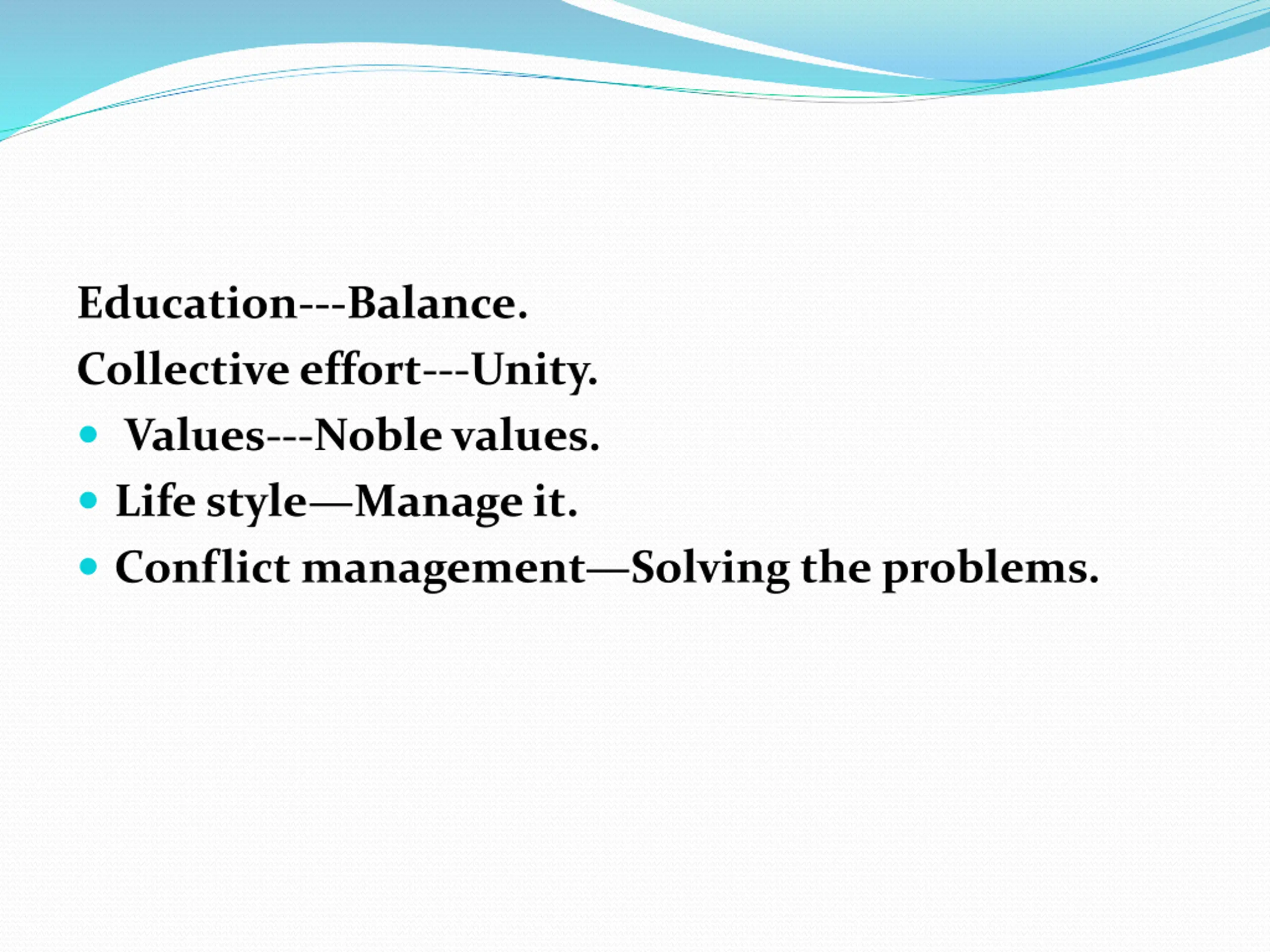 Education---Balance. Collective effort---Unity. Values---Noble values. Life style Manage it. Conflict management Solving the problems.