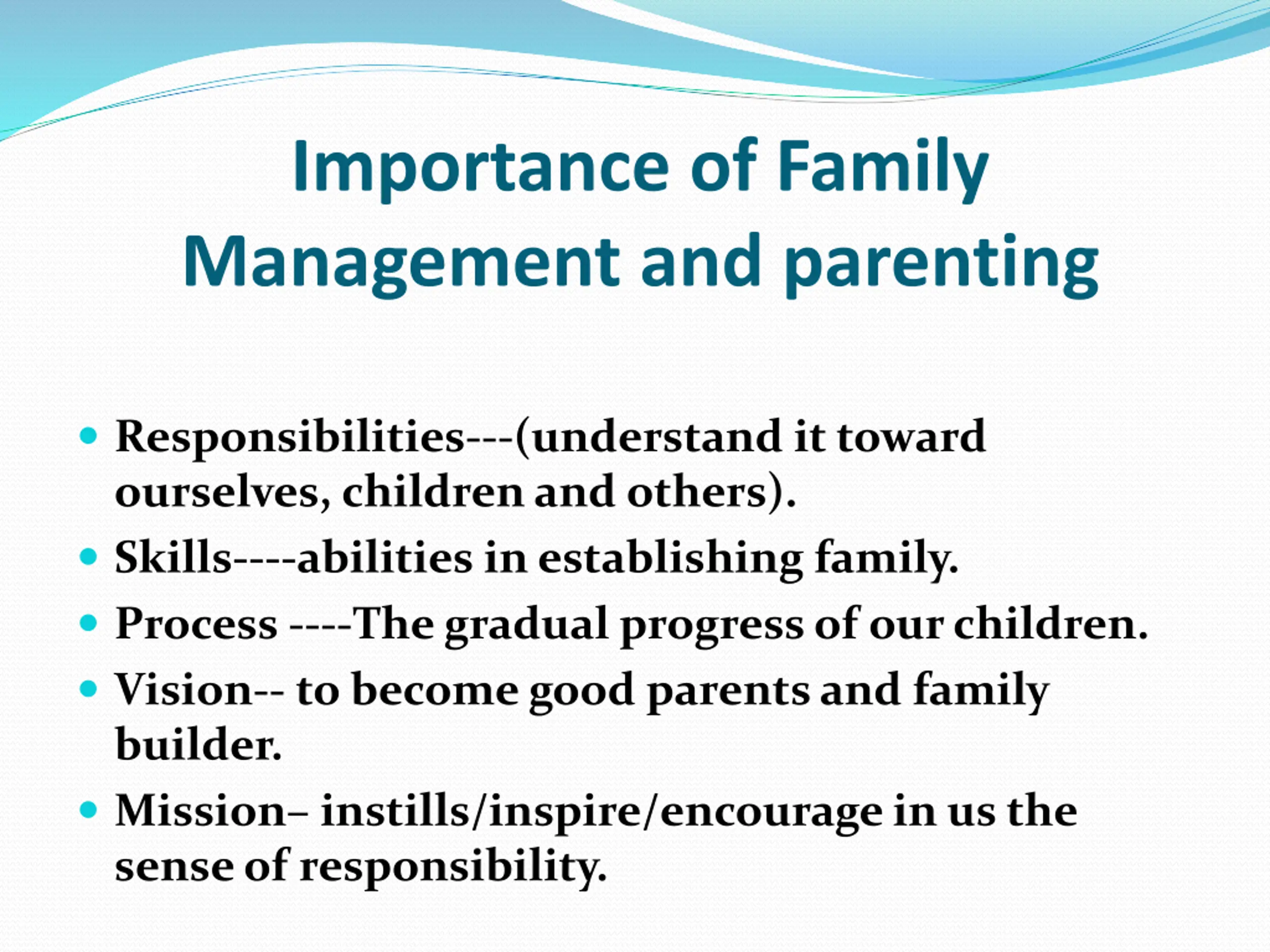 Importance of Family Management and parenting Responsibilities---(understand it toward ourselves, children and others). Skills----abilities in establishing family. Process ----The gradual progress of our children. Vision-- to become good parents and family builder. Mission instills/inspire/encourage in us the sense of responsibility.