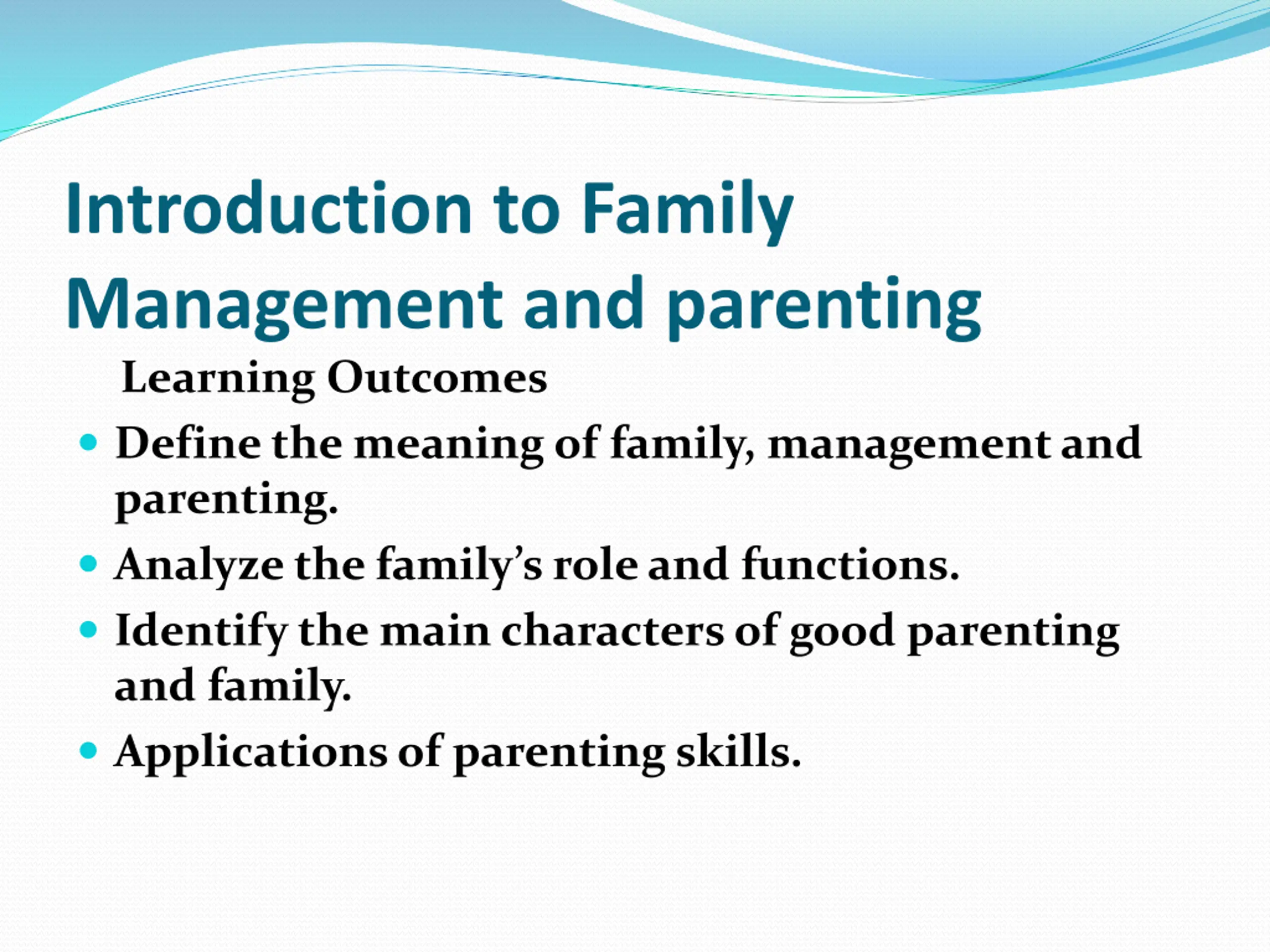 Introduction to Family Management and parenting Learning Outcomes Define the meaning of family, management and parenting. Analyze the family s role and functions. Identify the main characters of good parenting and family. Applications of parenting skills.