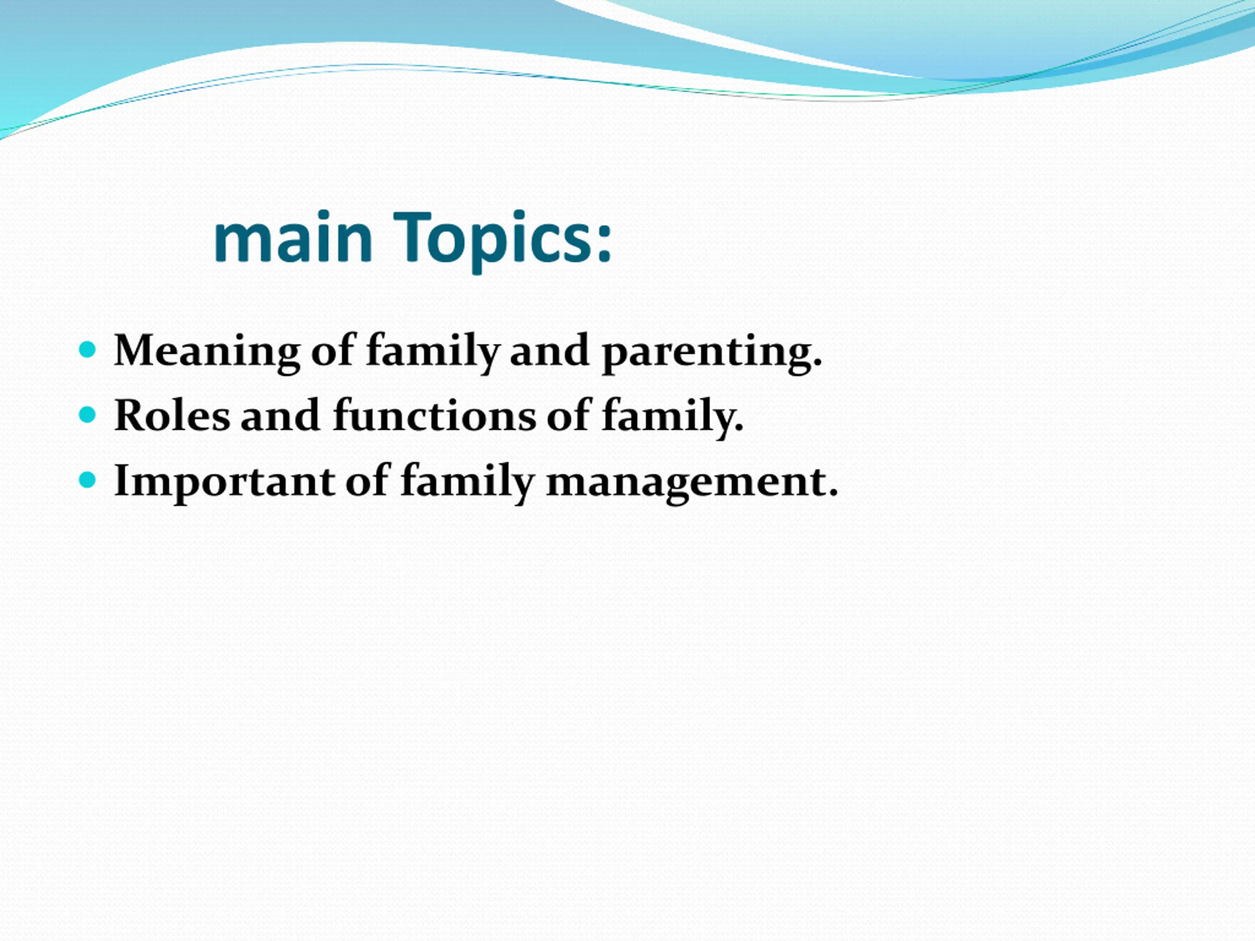 main Topics: Meaning of family and parenting. Roles and functions of family. Important of family management.