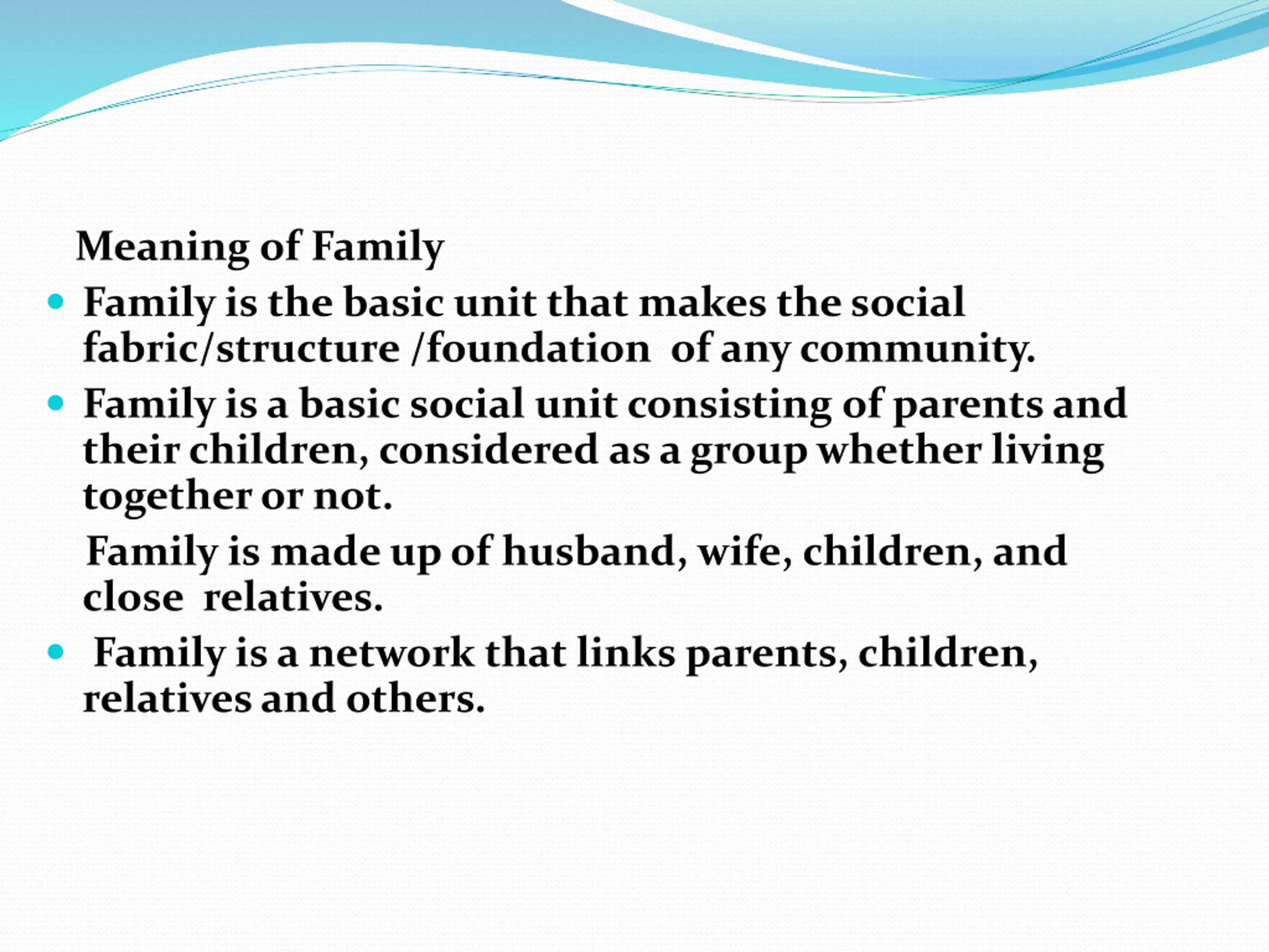 Meaning of Family Family is the basic unit that makes the social fabric/structure /foundation of any community. Family is a basic social unit consisting of parents and their children, considered as a group whether living together or not. Family is made up of husband, wife, children, and close relatives. Family is a network that links parents, children, relatives and others.