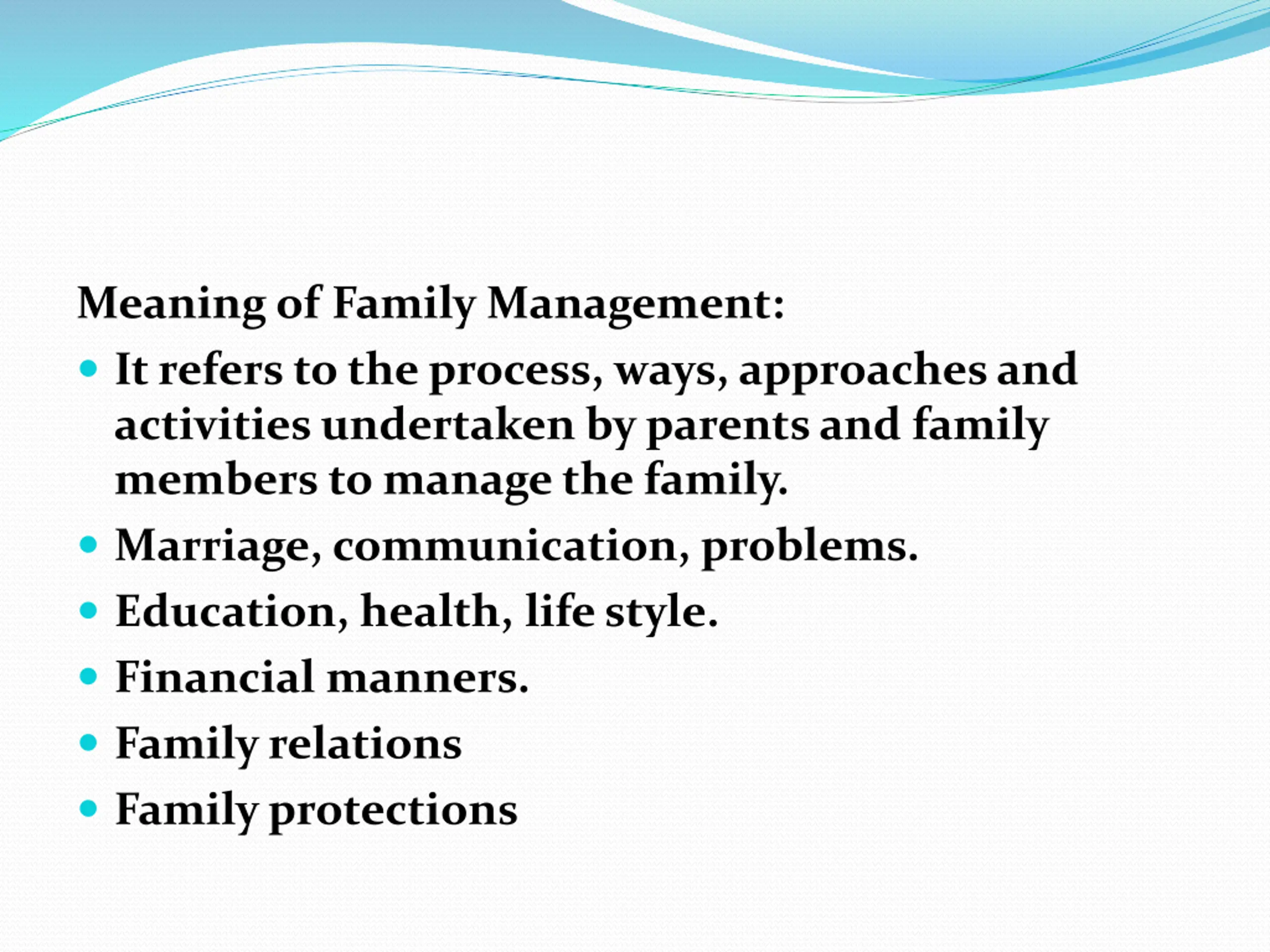 Meaning of Family Management: It refers to the process, ways, approaches and activities undertaken by parents and family members to manage the family. Marriage, communication, problems. Education, health, life style. Financial manners. Family relations Family protections