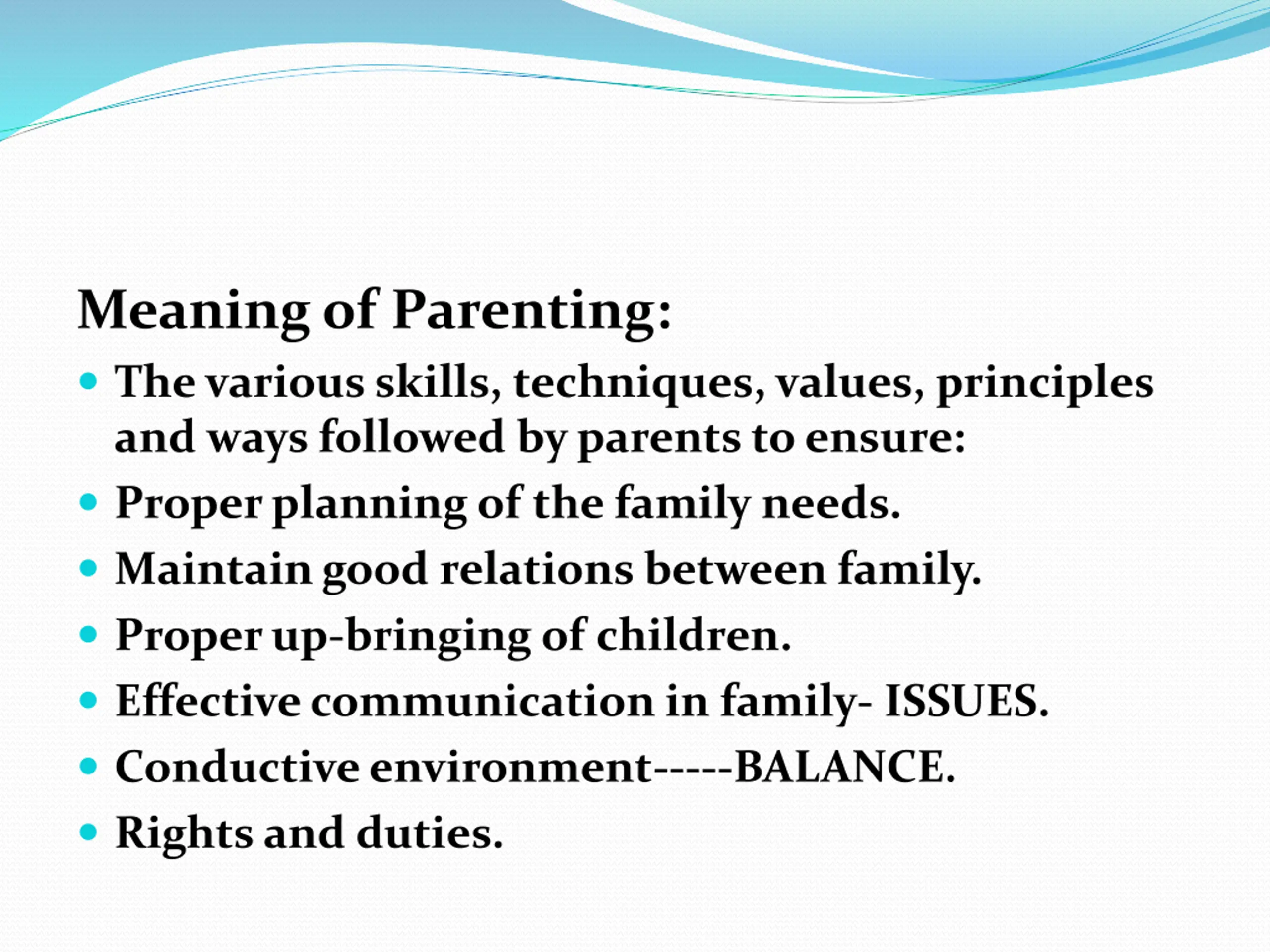 Meaning of Parenting: The various skills, techniques, values, principles and ways followed by parents to ensure: Proper planning of the family needs. Maintain good relations between family. Proper up-bringing of children. Effective communication in family- ISSUES. Conductive environment-----BALANCE. Rights and duties.
