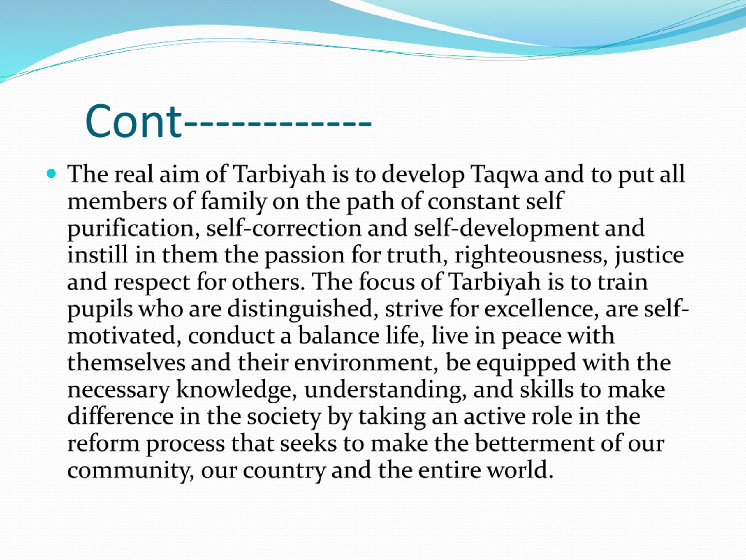 Cont------------ The real aim of Tarbiyah is to develop Taqwa and to put all members of family on the path of constant self purification, self-correction and self-development and instill in them the passion for truth, righteousness, justice and respect for others. The focus of Tarbiyah is to train pupils who are distinguished, strive for excellence, are self- motivated, conduct a balance life, live in peace with themselves and their environment, be equipped with the necessary knowledge, understanding, and skills to make difference in the society by taking an active role in the reform process that seeks to make the betterment of our community, our country and the entire world.