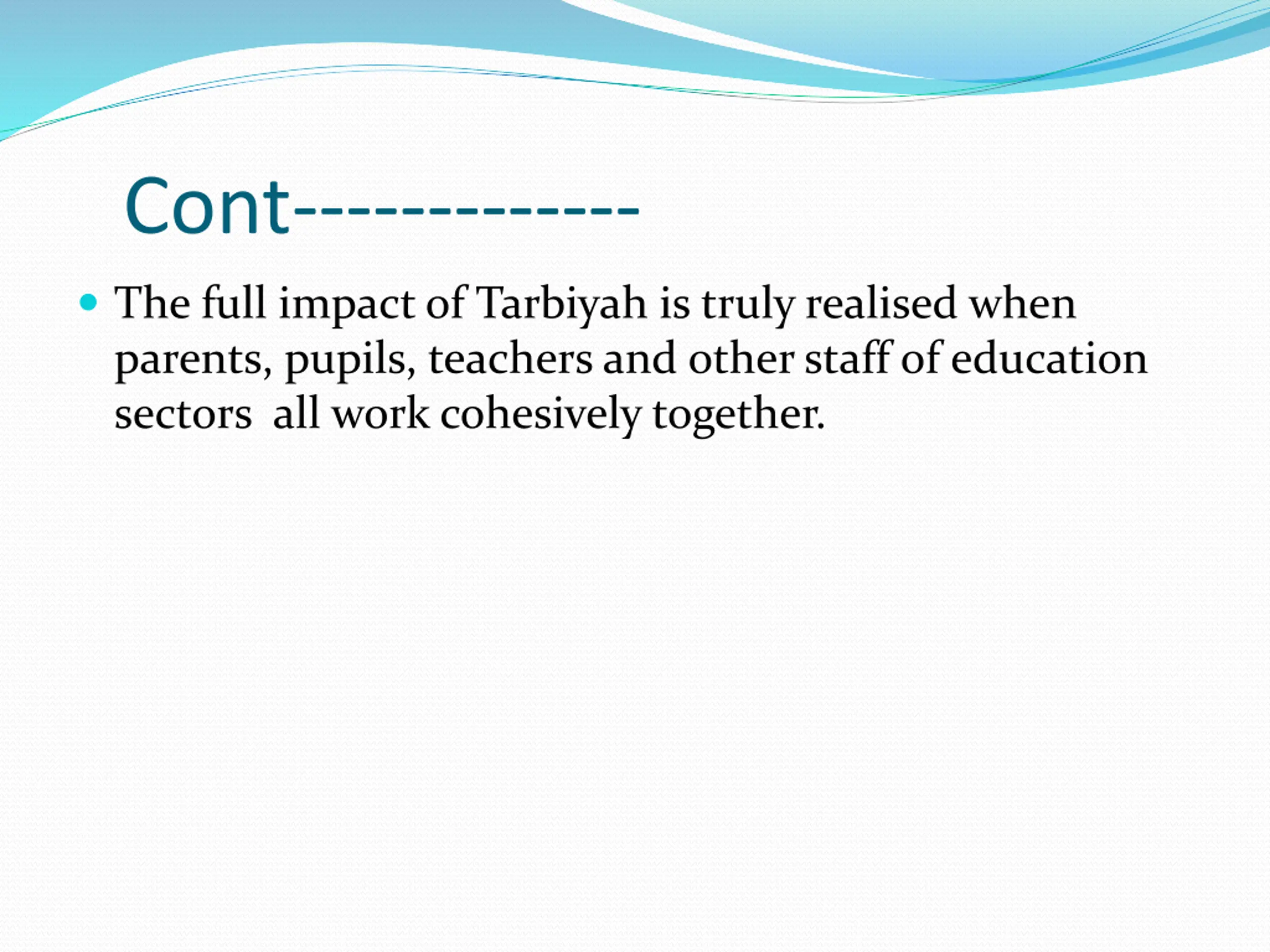 Cont------------- The full impact of Tarbiyah is truly realised when parents, pupils, teachers and other staff of education sectors all work cohesively together.