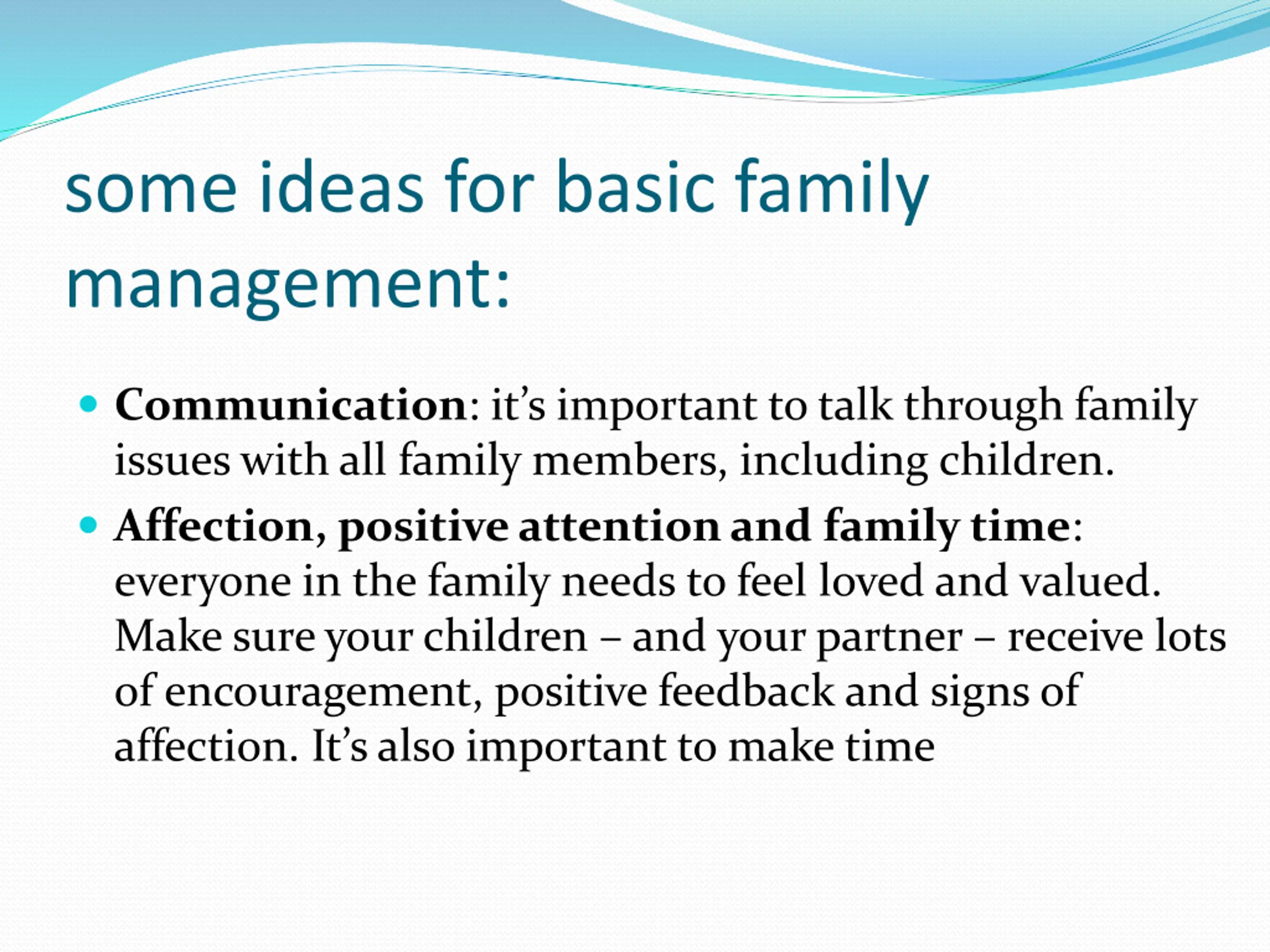 some ideas for basic family management: Communication: it s important to talk through family issues with all family members, including children. Affection, positive attention and family time: everyone in the family needs to feel loved and valued. Make sure your children and your partner receive lots of encouragement, positive feedback and signs of affection. It s also important to make time