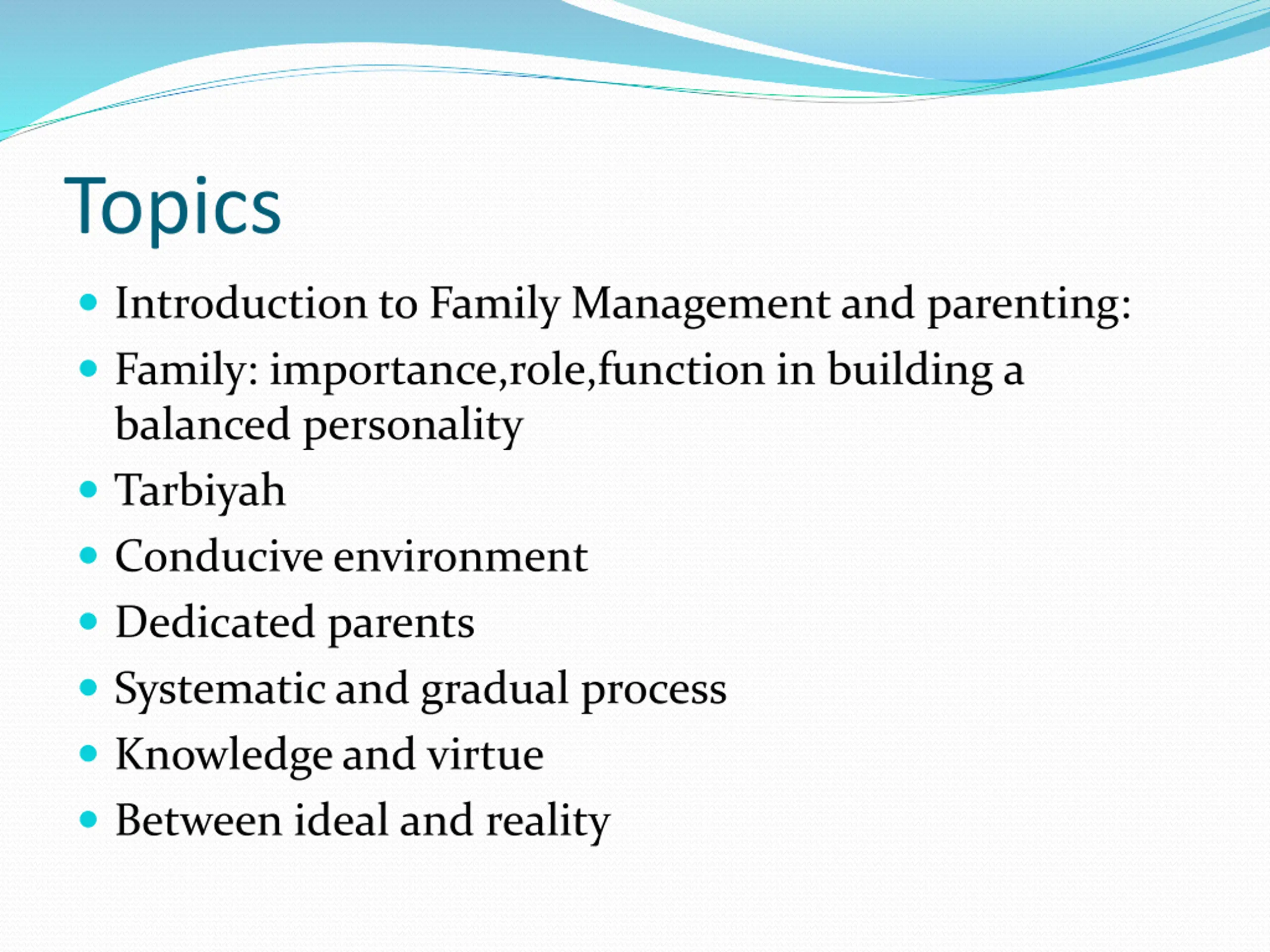 Topics Introduction to Family Management and parenting: Family: importance,role,function in building a balanced personality Tarbiyah Conducive environment Dedicated parents Systematic and gradual process Knowledge and virtue Between ideal and reality