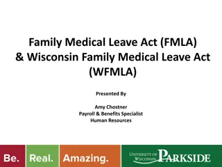 Family Medical Leave Act (FMLA) Tracking Days Single block of time (count in weeks) Intermittent Leave (count in hours 480 hours = 40 hrs/wk Smaller blocks of time if medically necessary (chemo) Part-time basis if medical note allows employee to work a partial day following surgery Appointments should be scheduled to minimize disruption to employer. Watch for abuse