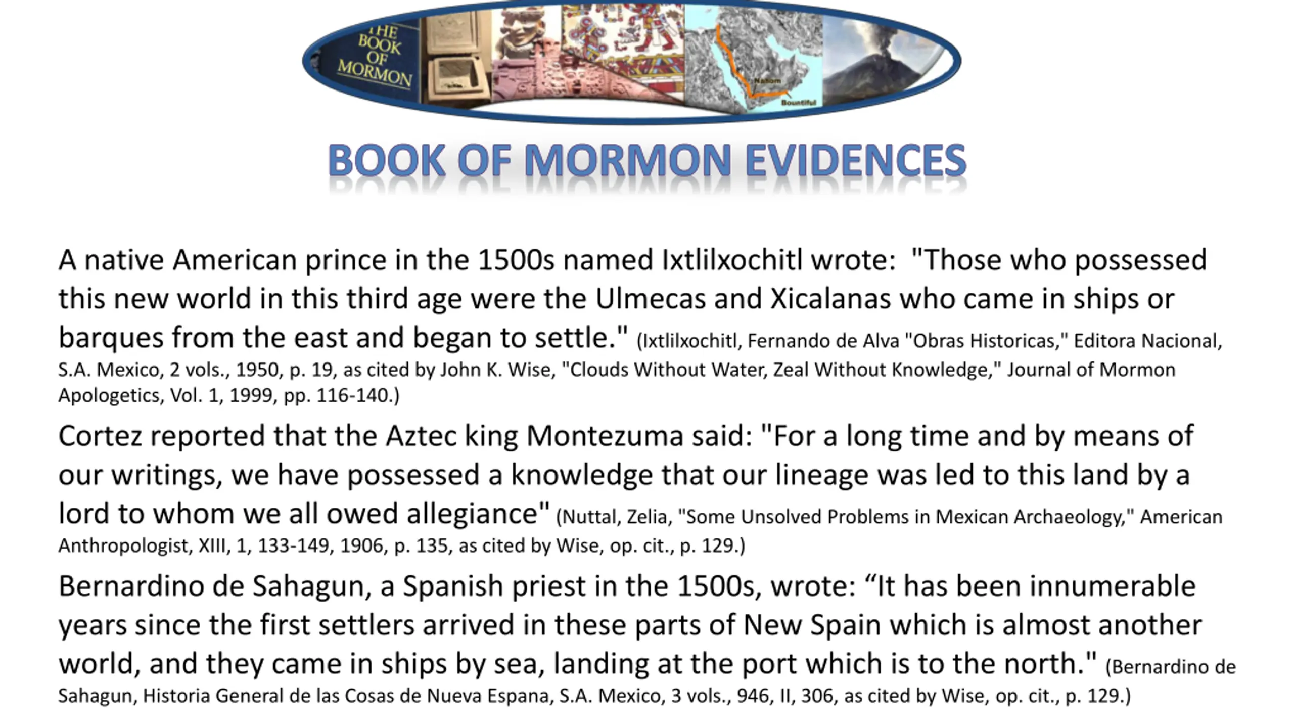 BOOK OF MORMON EVIDENCES A native American prince in the 1500s named Ixtlilxochitl wrote: "Those who possessed this new world in this third age were the Ulmecas and Xicalanas who came in ships or barques from the east and began to settle." (Ixtlilxochitl, Fernando de Alva "Obras Historicas," Editora Nacional, S.A. Mexico, 2 vols., 1950, p. 19, as cited by John K. Wise, "Clouds Without Water, Zeal Without Knowledge," Journal of Mormon Apologetics, Vol. 1, 1999, pp. 116-140.) Cortez reported that the Aztec king Montezuma said: "For a long time and by means of our writings, we have possessed a knowledge that our lineage was led to this land by a lord to whom we all owed allegiance" (Nuttal, Zelia, "Some Unsolved Problems in Mexican Archaeology," American Anthropologist, XIII, 1, 133-149, 1906, p. 135, as cited by Wise, op. cit., p. 129.) Bernardino de Sahagun, a Spanish priest in the 1500s, wrote: It has been innumerable years since the first settlers arrived in these parts of New Spain which is almost another world, and they came in ships by sea, landing at the port which is to the north." (Bernardino de Sahagun, Historia General de las Cosas de Nueva Espana, S.A. Mexico, 3 vols., 946, II, 306, as cited by Wise, op. cit., p. 129.)