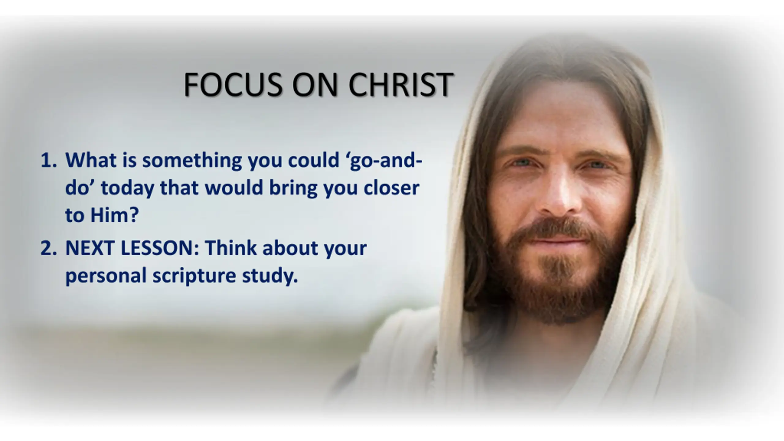 FOCUS ON CHRIST 1. What is something you could go-and- do today that would bring you closer to Him? 2. NEXT LESSON: Think about your personal scripture study.