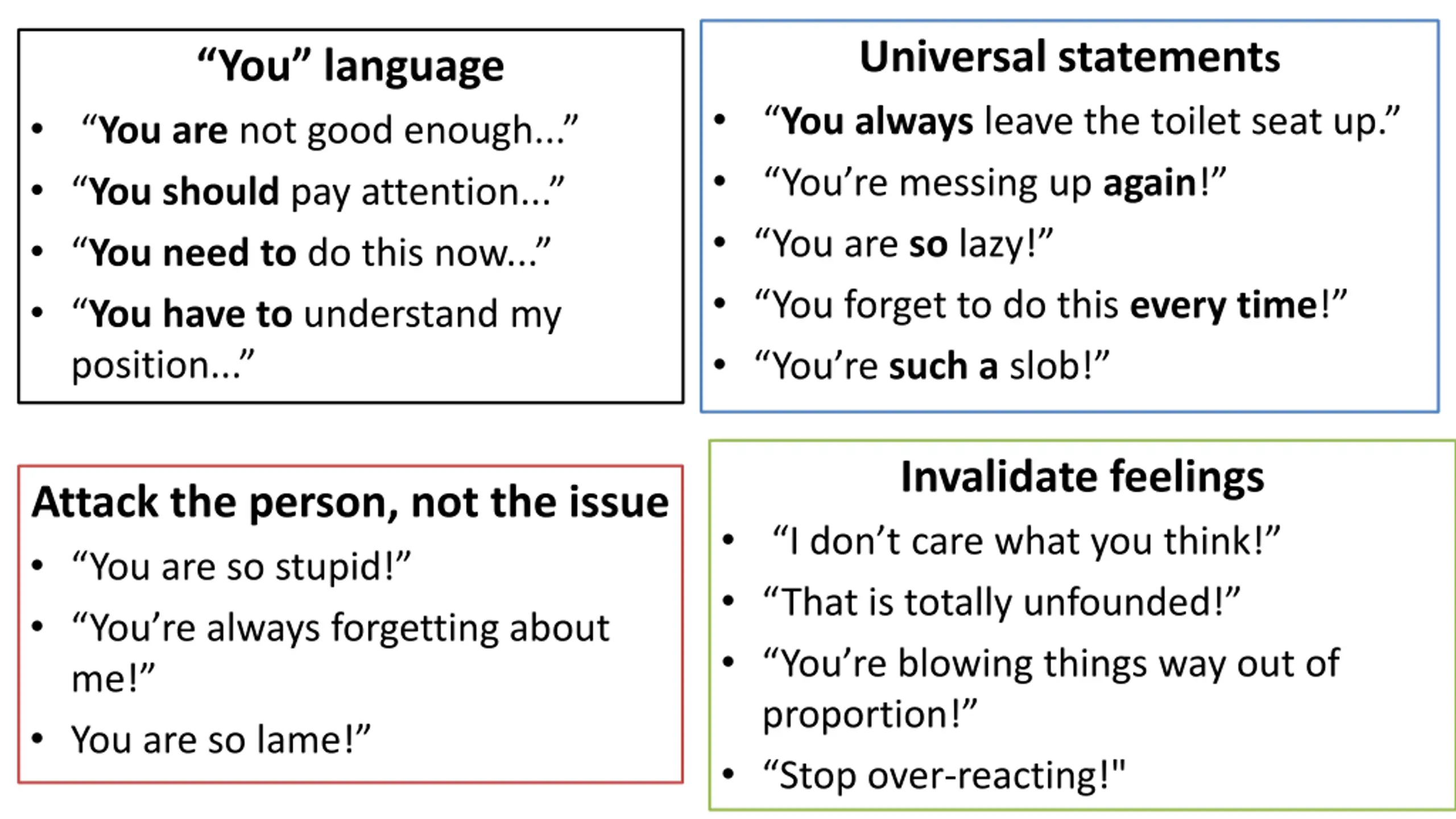 Universal statements You always leave the toilet seat up. You re messing up again! You are so lazy! You forget to do this every time! You re such a slob! You language You are not good enough... You should pay attention... You need to do this now... You have to understand my position... Invalidate feelings I don t care what you think! That is totally unfounded! You re blowing things way out of proportion! Stop over-reacting!" Attack the person, not the issue You are so stupid! You re always forgetting about me! You are so lame!