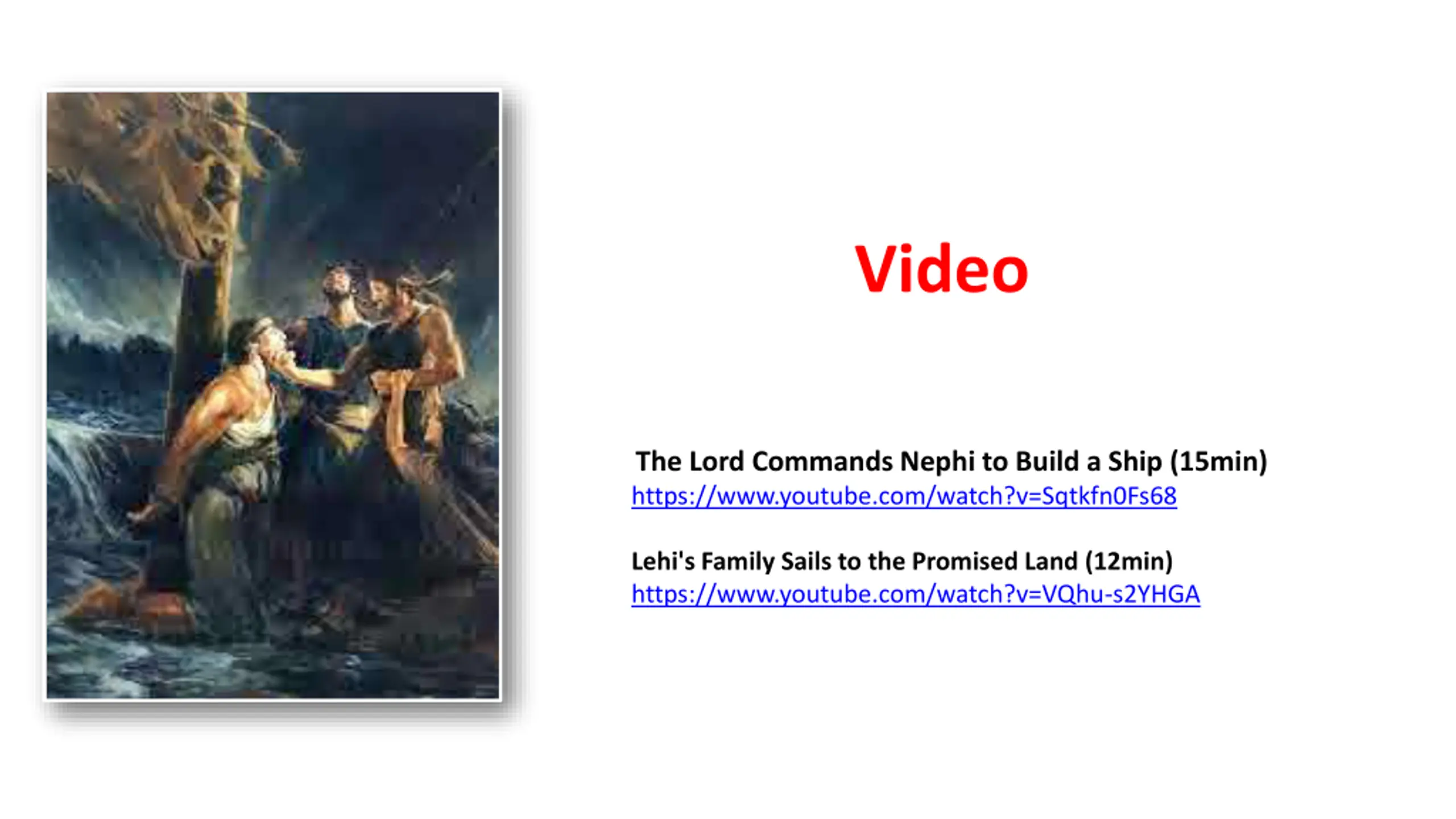 Video The Lord Commands Nephi to Build a Ship (15min) https://www.youtube.com/watch?v=Sqtkfn0Fs68 Lehi's Family Sails to the Promised Land (12min) https://www.youtube.com/watch?v=VQhu-s2YHGA