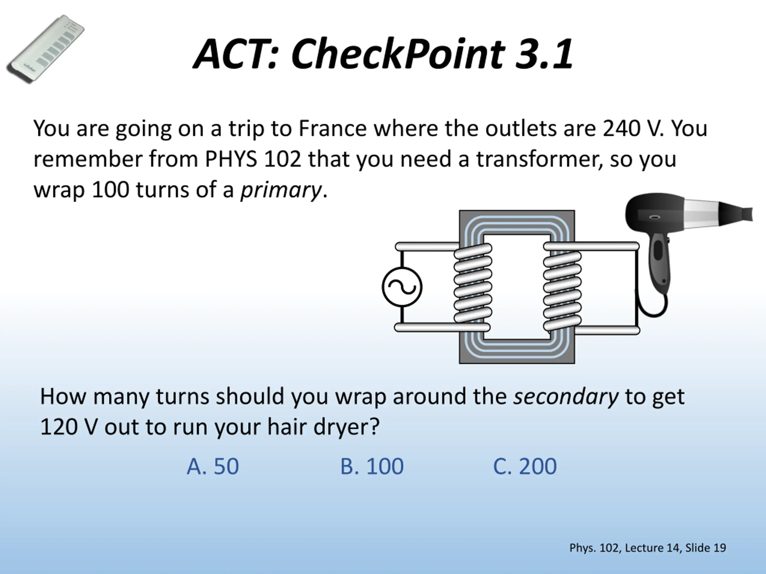 ACT: CheckPoint 3.1 You are going on a trip to France where the outlets are 240 V. You remember from PHYS 102 that you need a transformer, so you wrap 100 turns of a primary. How many turns should you wrap around the secondary to get 120 V out to run your hair dryer? A. 50 B. 100 C. 200 Phys. 102, Lecture 14, Slide 19