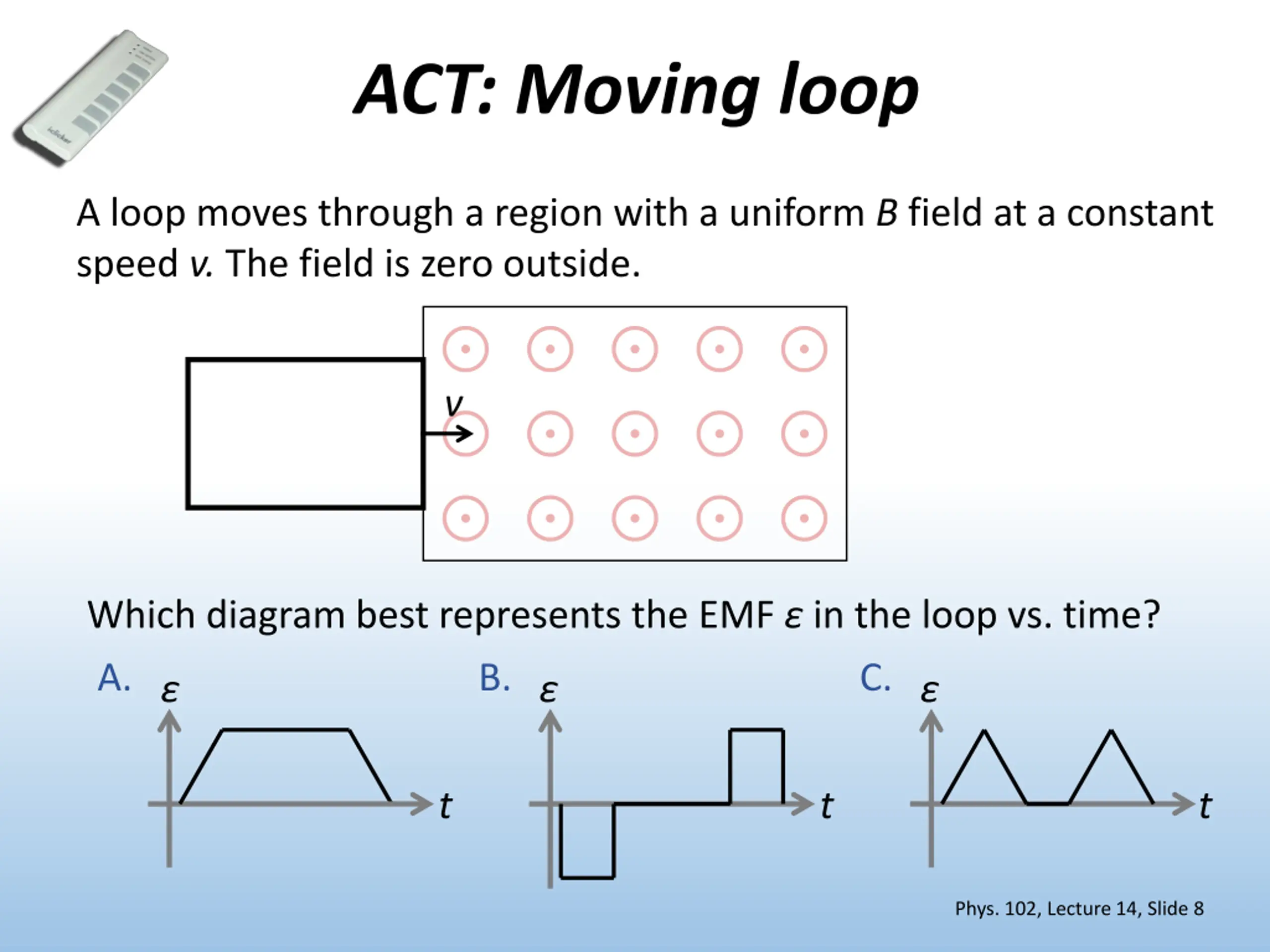 ACT: Moving loop A loop moves through a region with a uniform B field at a constant speed v. The field is zero outside. v Which diagram best represents the EMF in the loop vs. time? A. B. C. t t t Phys. 102, Lecture 14, Slide 8