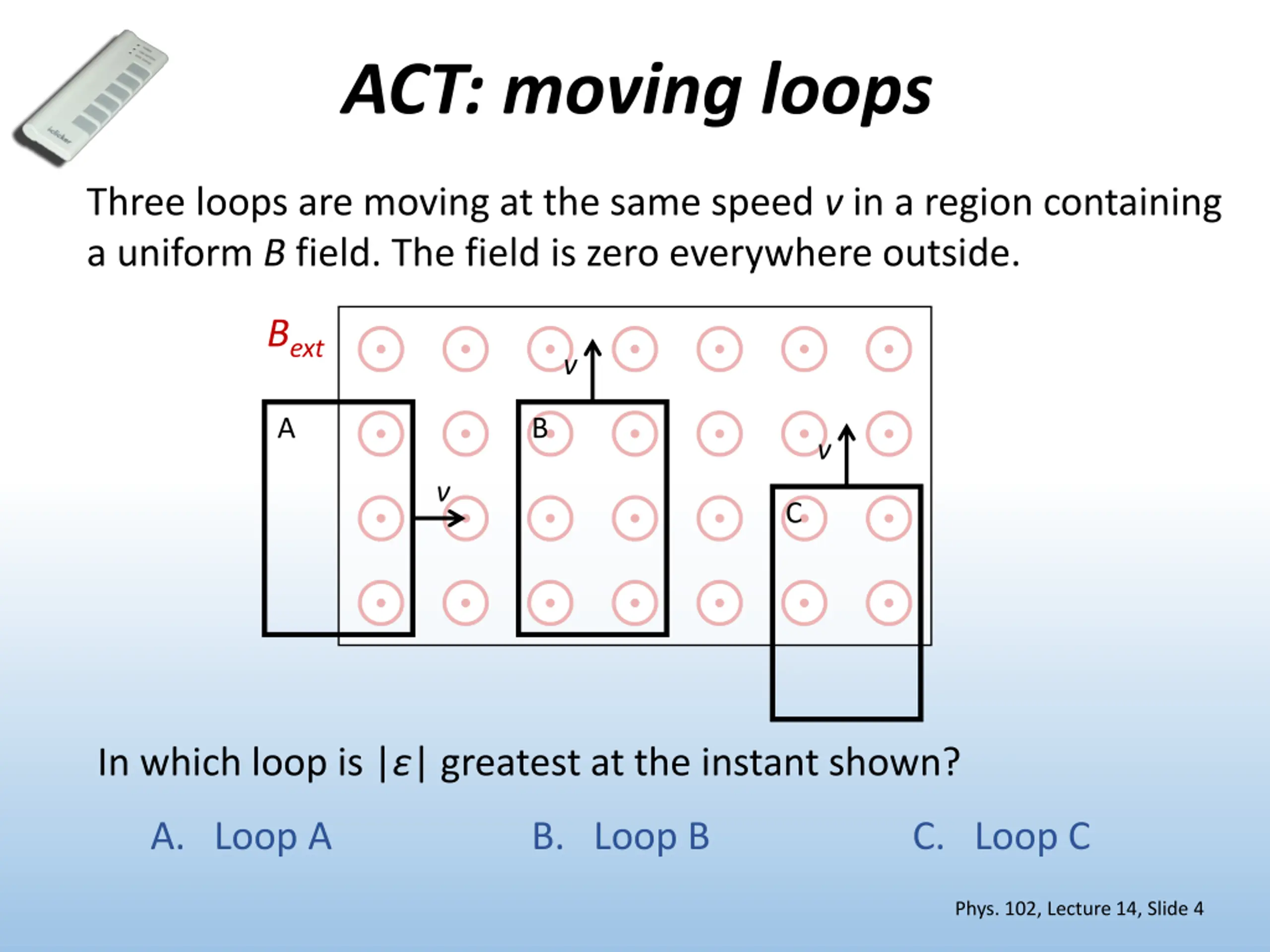 Moving loops revisited Three loops are moving at the same speed v in a region containing a uniform B field. The field is zero everywhere outside. Bext w v A B v v C L Phys. 102, Lecture 14, Slide 7