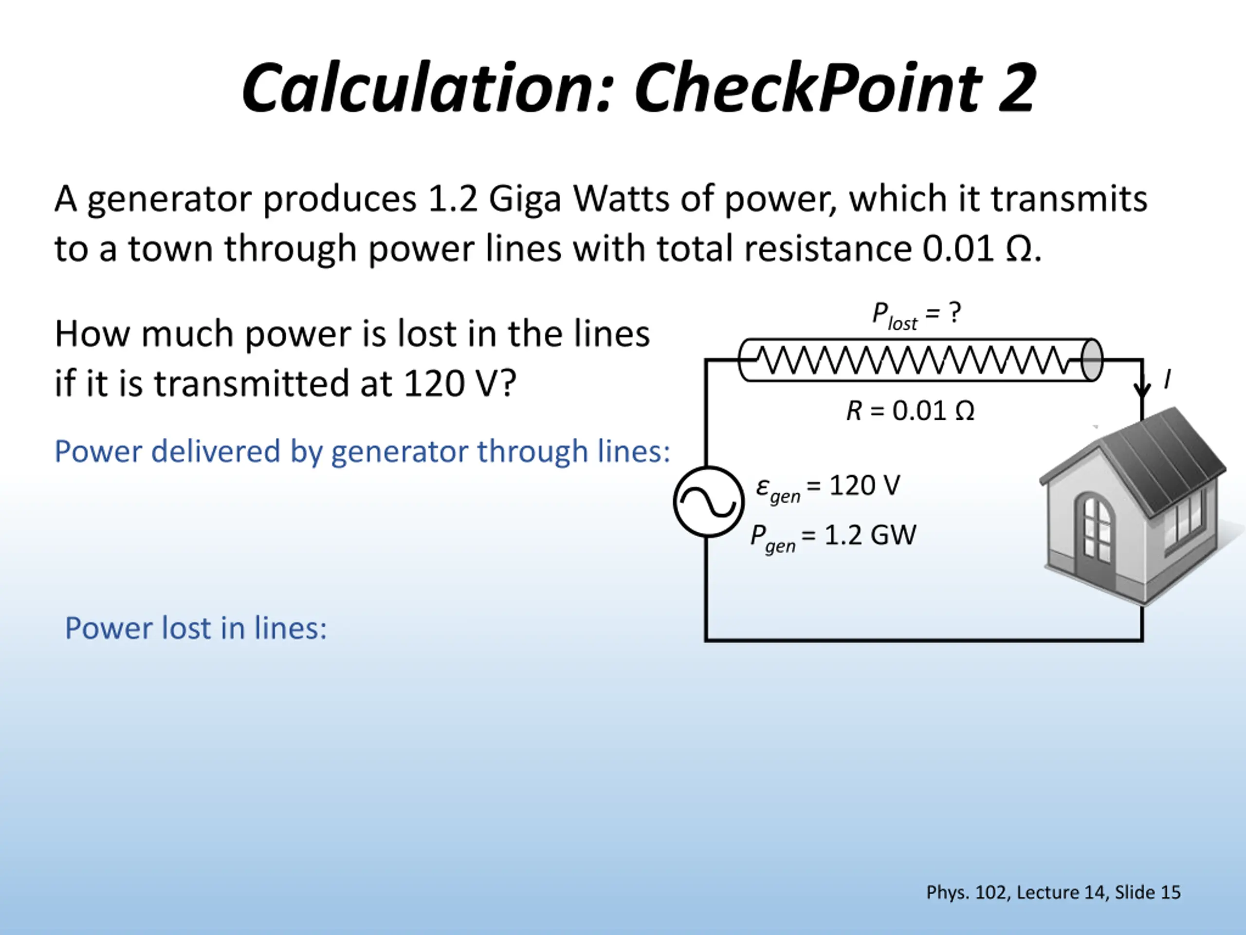 Calculation: CheckPoint 2 A generator produces 1.2 Giga Watts of power, which it transmits to a town through power lines with total resistance 0.01 . Plost = ? How much power is lost in the lines if it is transmitted at 120 V? I R = 0.01 Power delivered by generator through lines: gen = 120 V Pgen= 1.2 GW Power lost in lines: Phys. 102, Lecture 14, Slide 15