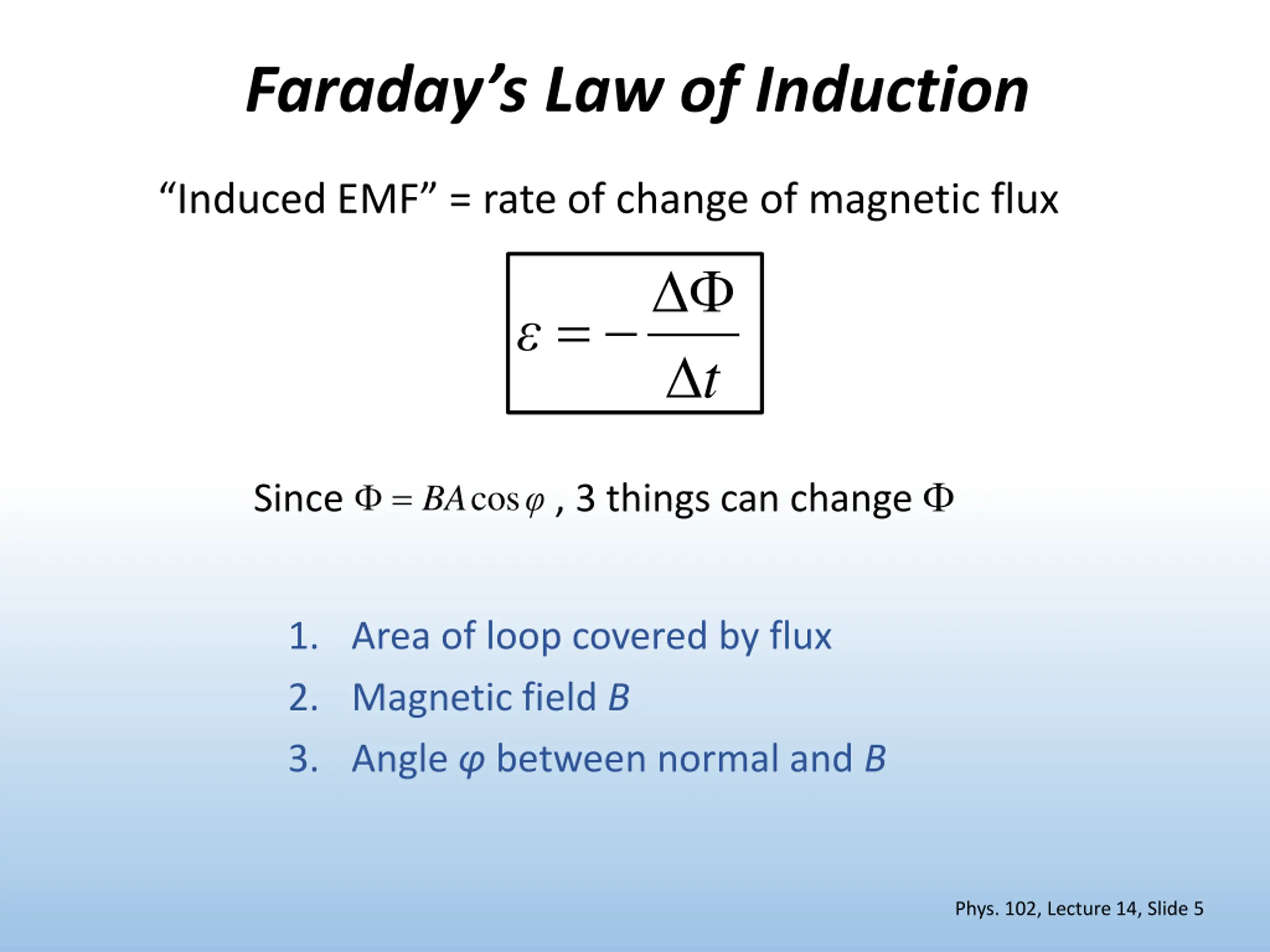Faradays Law of Induction Induced EMF = rate of change of magnetic flux = t , 3 things can change = cos BA Since 1. Area of loop covered by flux 2. Magnetic field B 3. Angle between normal and B Phys. 102, Lecture 14, Slide 5