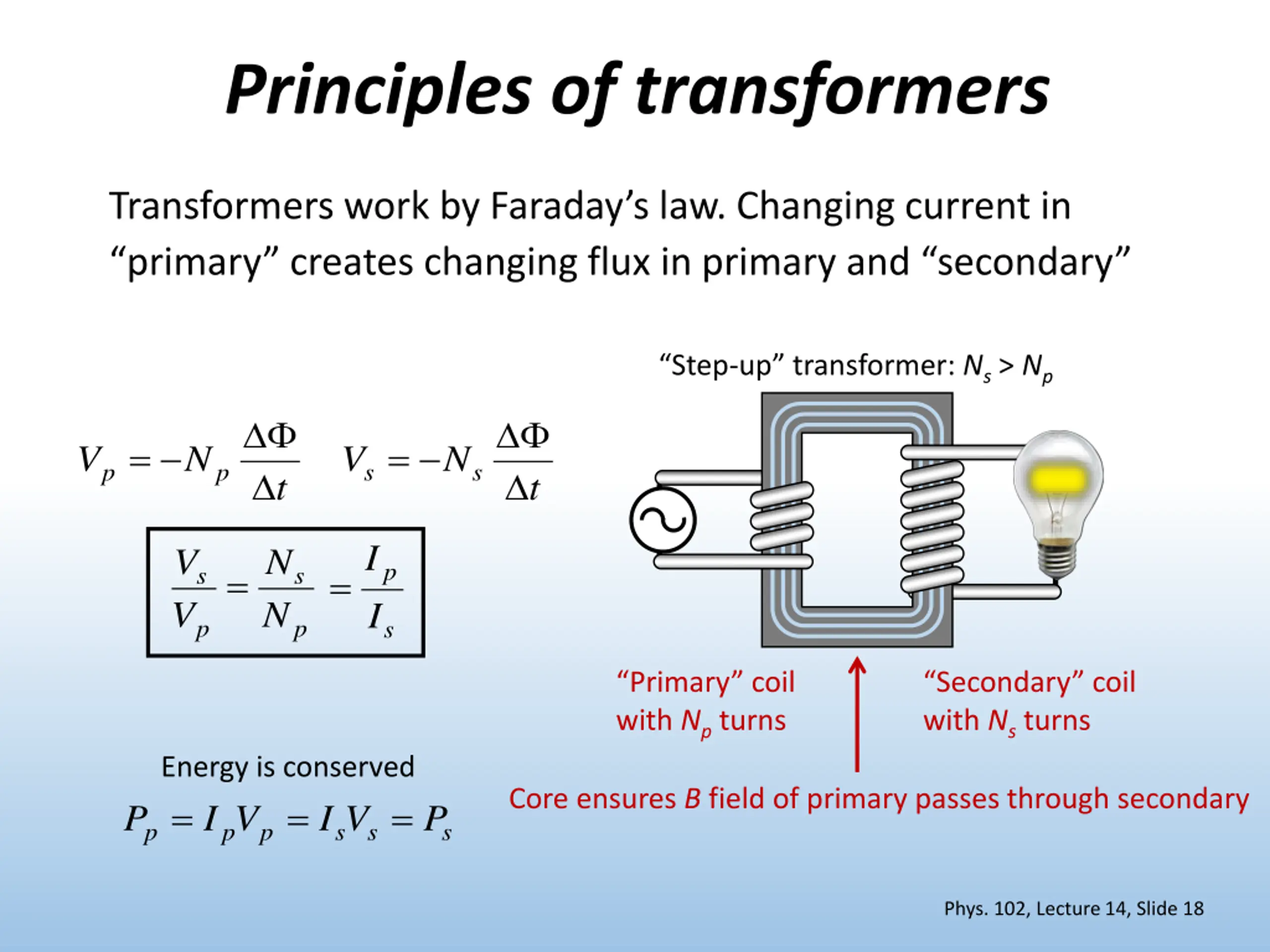 Principles of transformers Transformers work by Faraday s law. Changing current in primary creates changing flux in primary and secondary Step-up transformer: Ns > Np = = V N V N p p s s t t I I V V N N p = s s = p p s Primary coil with Np turns Secondary coil with Ns turns Energy is conserved Core ensures B field of primary passes through secondary = = = P I V s s I V P p p p s Phys. 102, Lecture 14, Slide 18