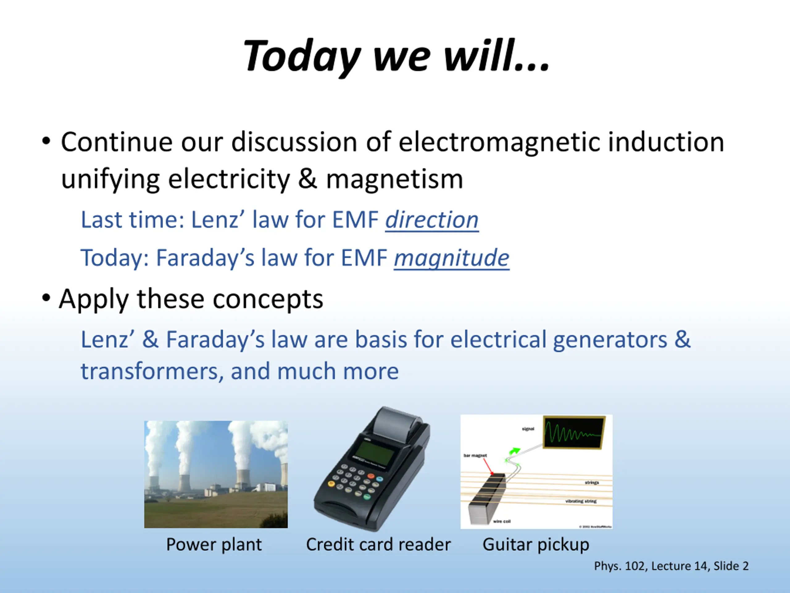 Today we will... Continue our discussion of electromagnetic induction unifying electricity & magnetism Last time: Lenz law for EMF direction Today: Faraday s law for EMF magnitude Apply these concepts Lenz & Faraday s law are basis for electrical generators & transformers, and much more Power plant Credit card reader Guitar pickup Phys. 102, Lecture 14, Slide 2